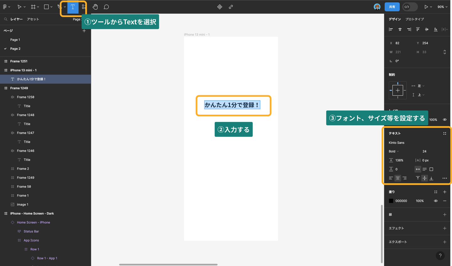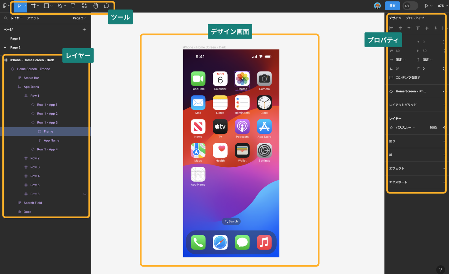 Frameはデザインを入れる箱みたいなものです。なくてもデザインできるのですが書き出したり、要素を整列させるのには必要なのでFrameの中にデザインすることが多いです。UIはFrameの中にボタンやテキストを配置していくのが一般的です。