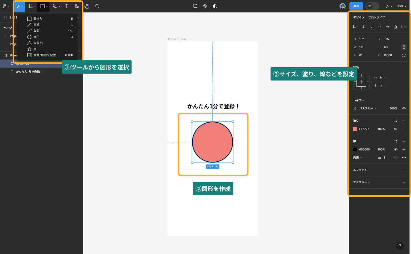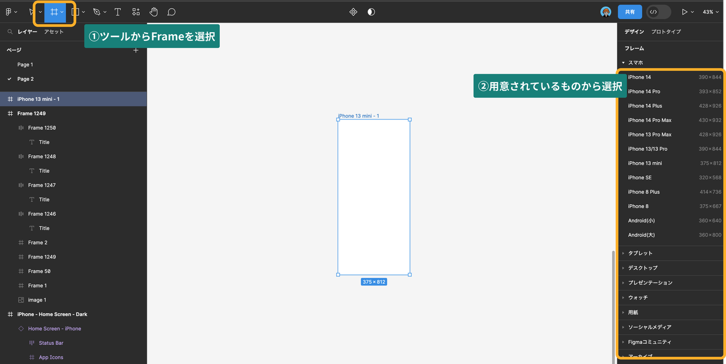 ②ではFigmaで用意されているFrameを使用しましたが、直接大きさを設定することも可能です。