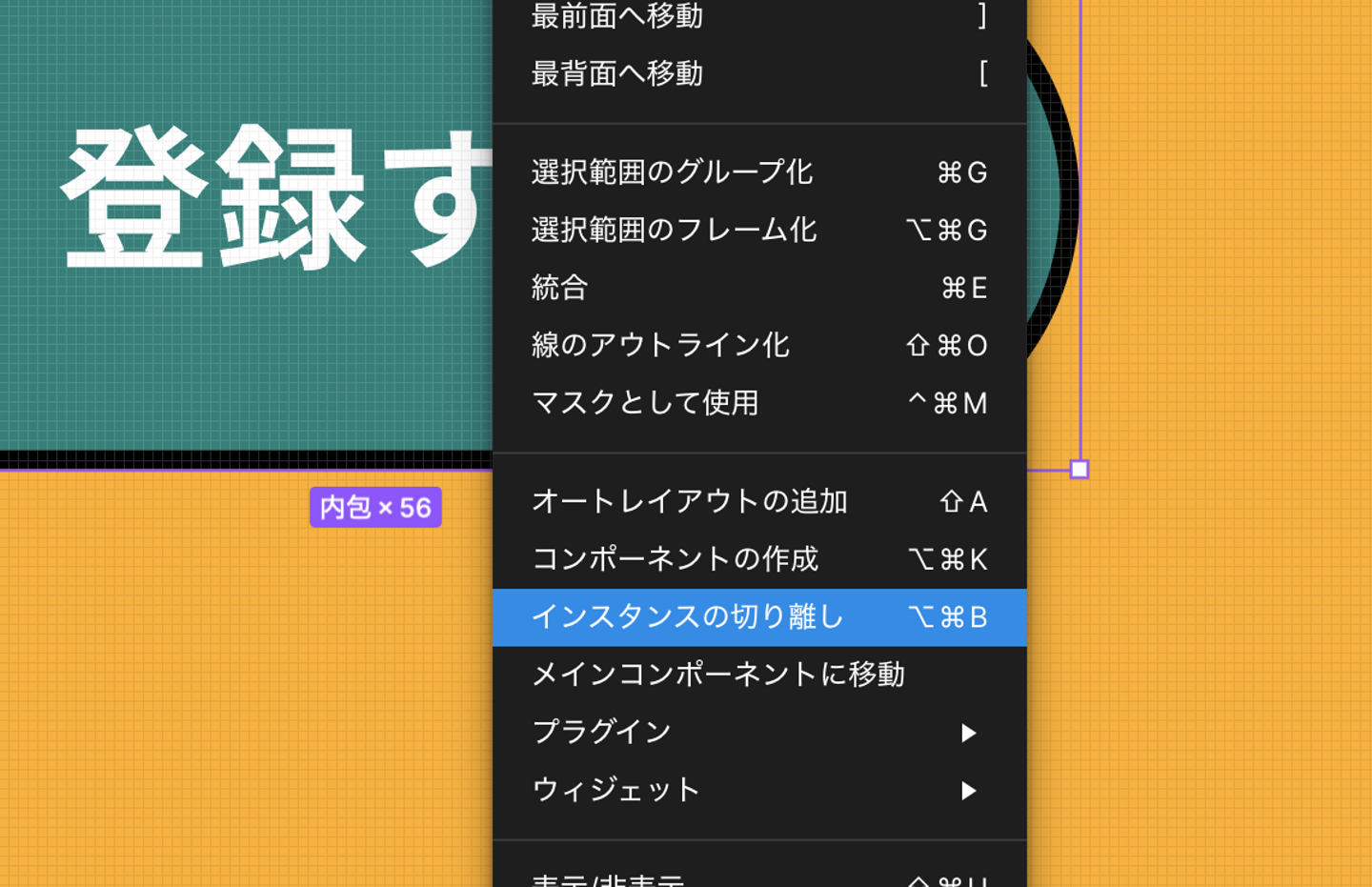 インスタンスはテキストの内容や塗りの色を変更したりすることはできますが、インスタンス内に配置されたオブジェクトの位置やサイズを変更することはできません。そのためマスターコンポーネントとはパターンが異なるものを作らなければならないときは、インスタンスを解除する必要があります。