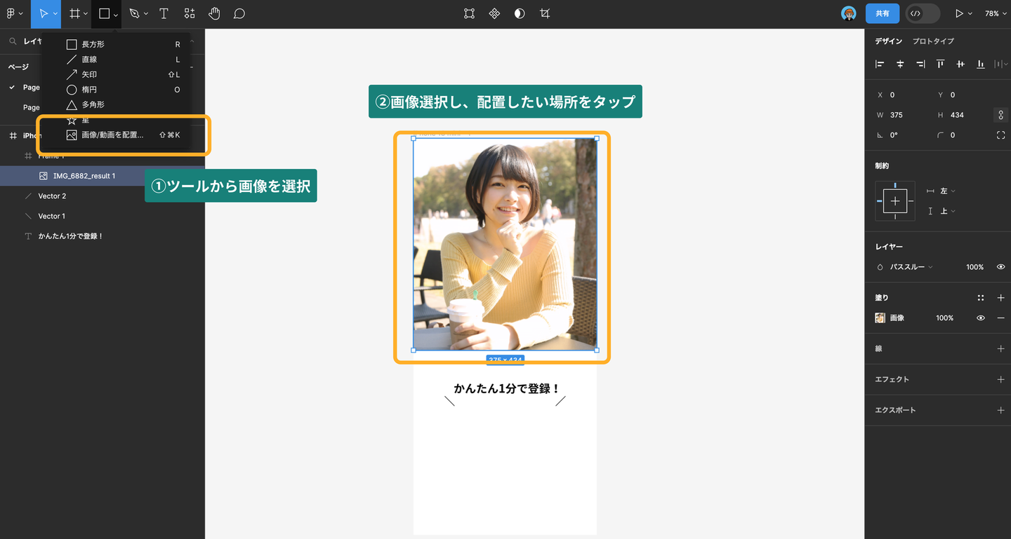 ツールから画像→使う画像を選択→配置したい場所をタップする