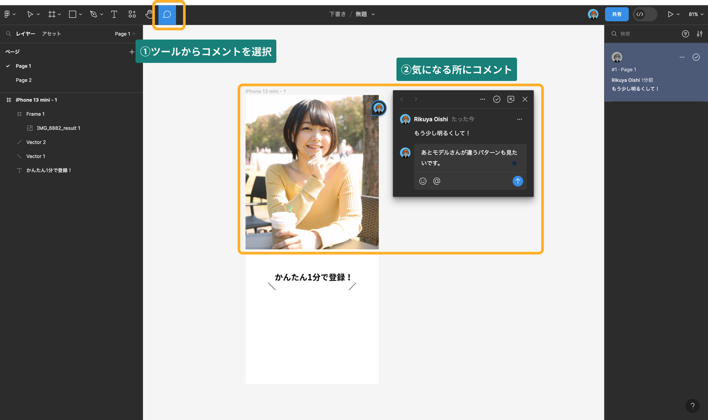 デザインデータに直接コメントを残せます。他のコミュニケーションツールを活用することなく、FBを残せたり仕様を詰めたりできるのでかなり便利です!
