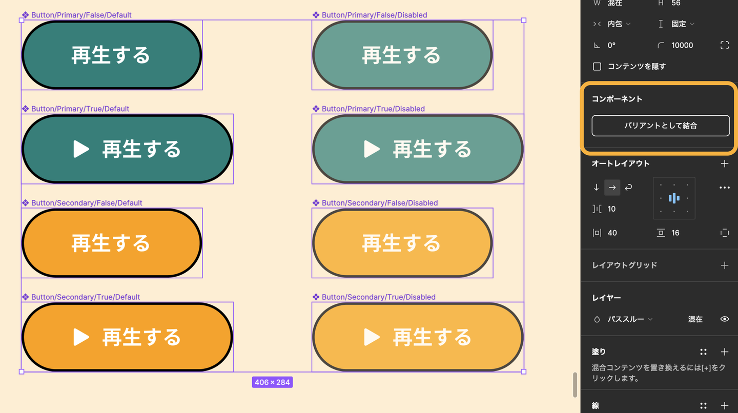 対象のコンポーネントを全て選択し、プロパティパネル内にある「バリアントを結合」のボタンを押します。