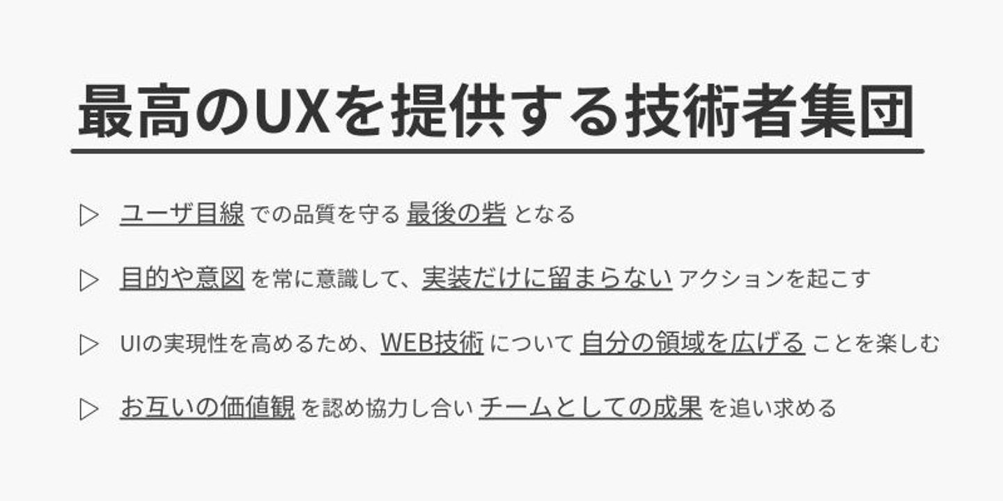 フロントエンドチームではメンバー全員が共有する長期的な方向性や価値観を明確にするために、チームとしてのビジョンを定義しています(下記画像参照)。