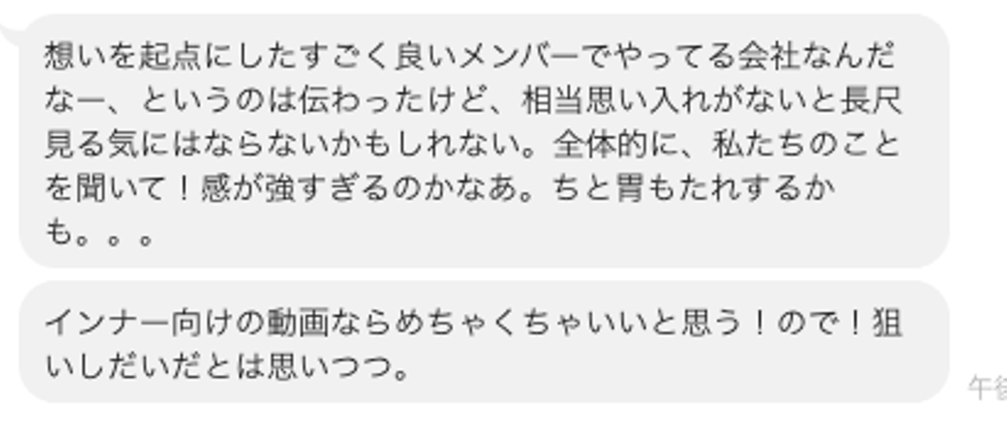 記載はなくても、ムービー作ろうとなった際にmtgが盛り上がったのは細胞で覚えています。ムービー製作はカロリーもコストもそれなりにかかるので、「なんのために作るの?」「ROI見合うの?」などと考え出すと「ムービーじゃなくてもいいか」「LP一枚作るか」となりがち(少なくとも弊社では)。