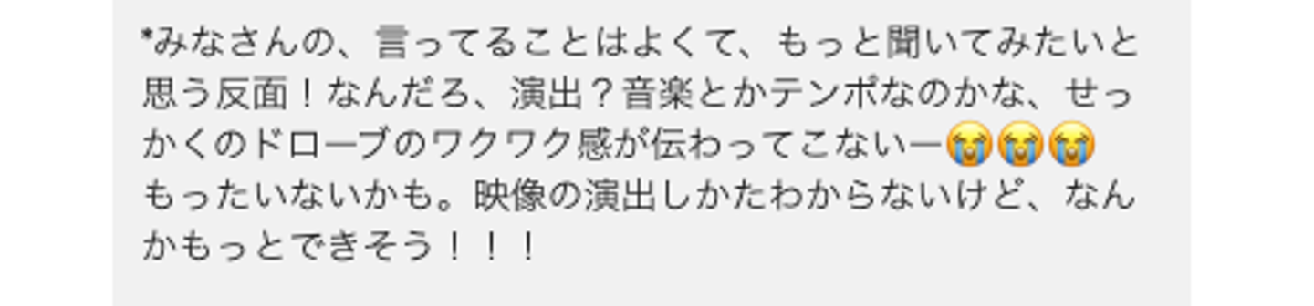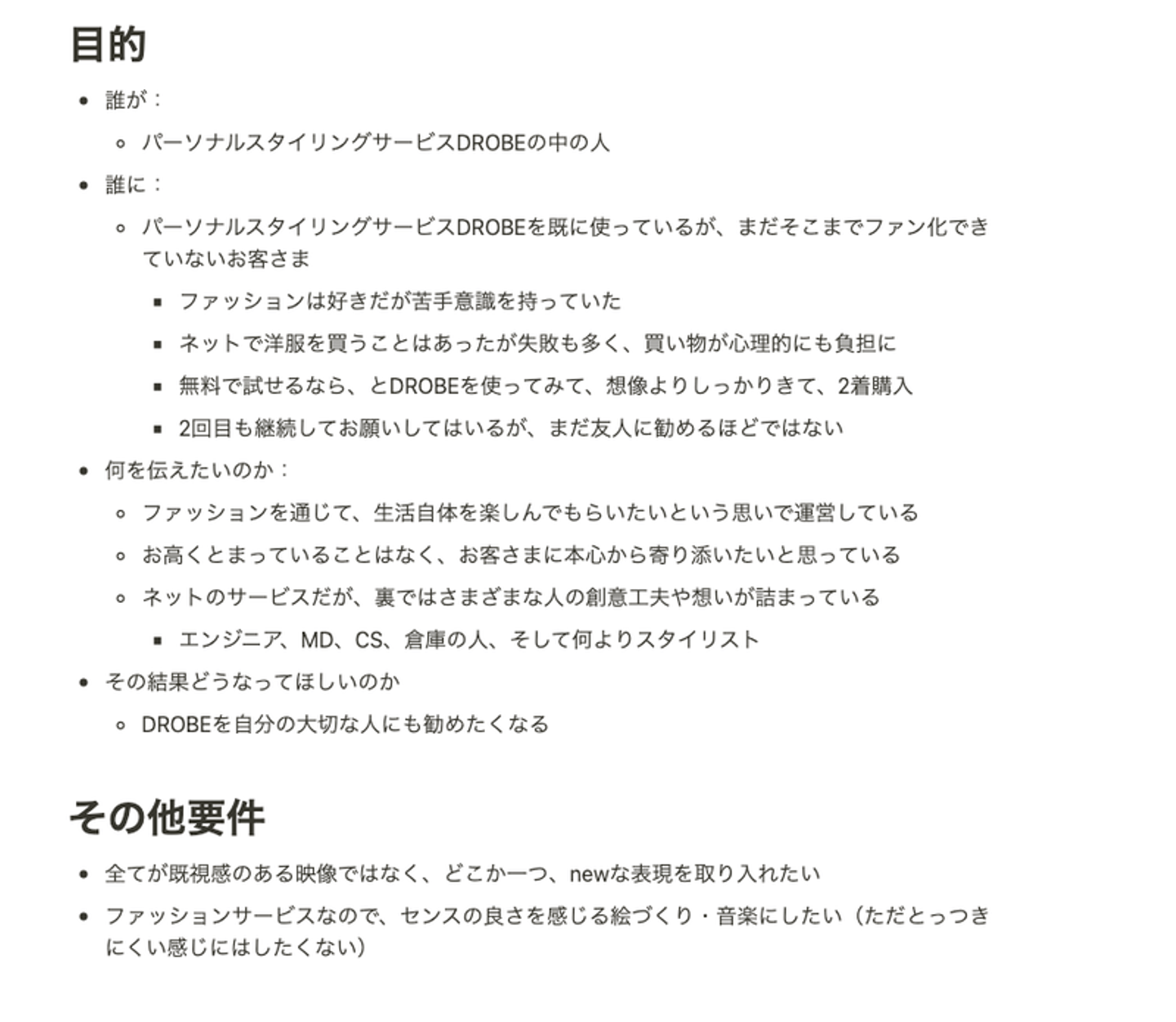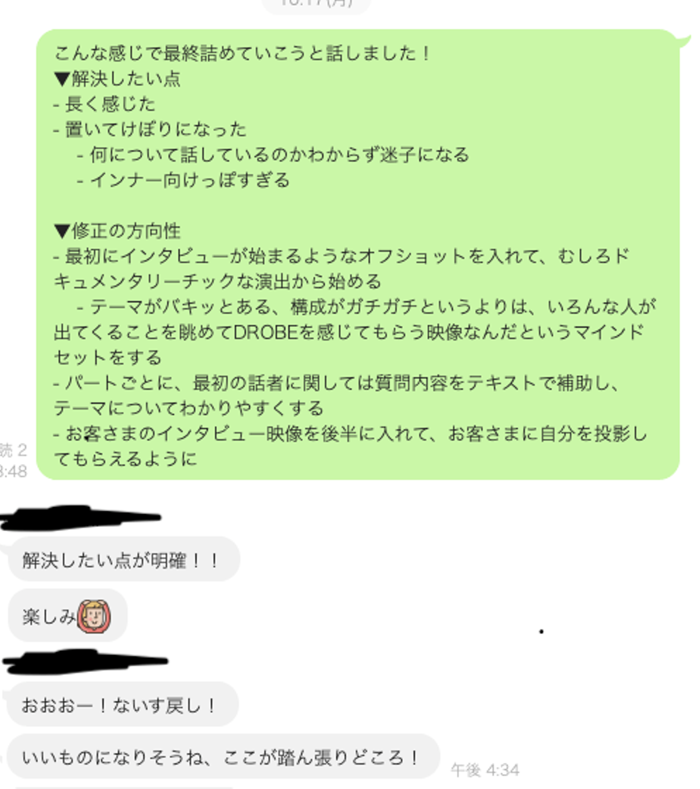 映像に関しては素人で、映像作品のインプットの量も全然少ないわたしたちが出した意見を、そのまま鵜呑みにされてしまうと、確実にアウトプットの質は下がります。でも、サービスについてやDROBEについて一番知っているのはこちらなので、そこで感じた違和感は伝えるべきだし、こうしたいがあればそれも伝える努力をするべきだと思っています。