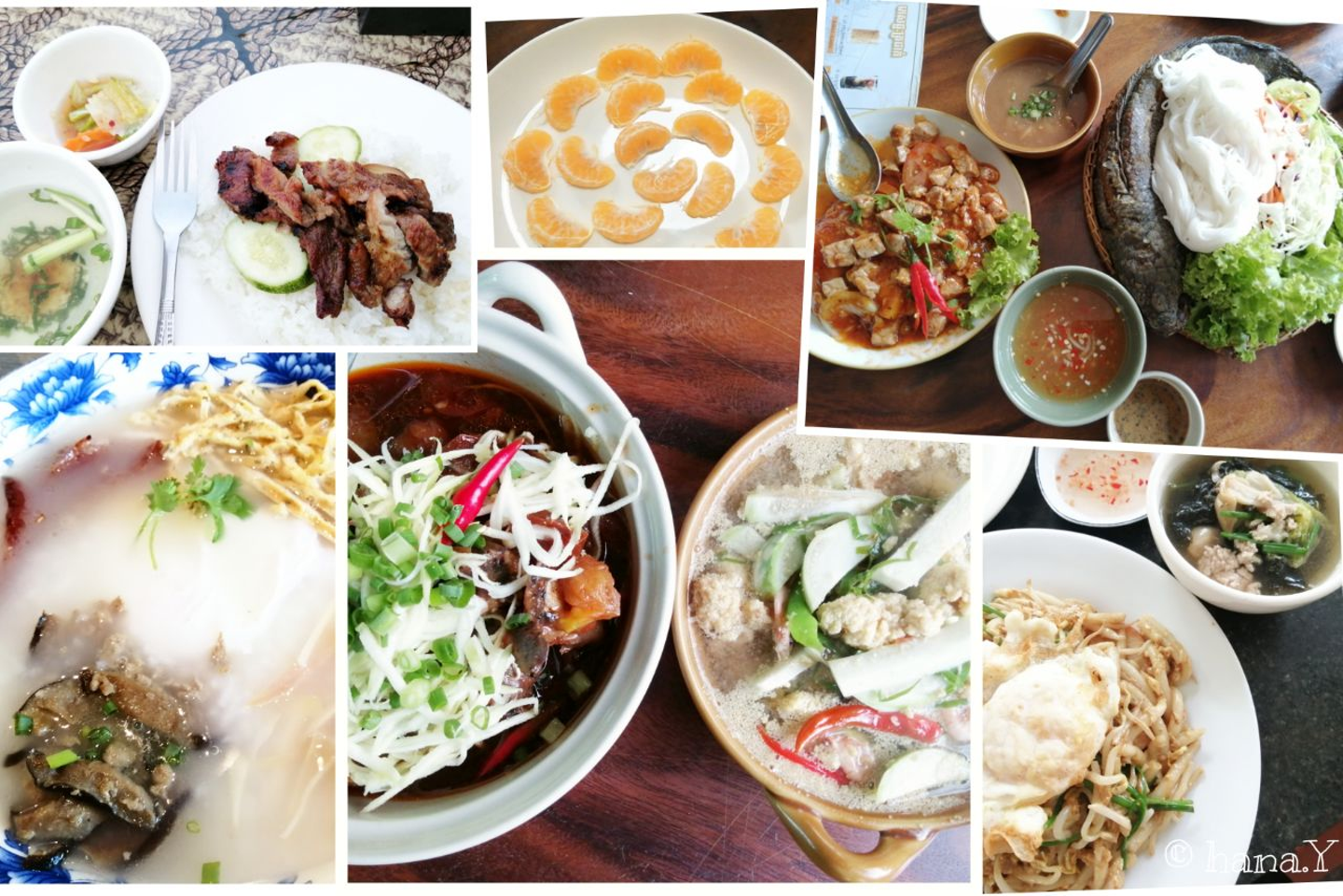 クメール(カンボジア)料理の定番の朝メニューは、豚ご飯、お粥、焼きそばなど。屋台だと1ドルから、レストランでも3、4ドル程度で食べられます。ランチは魚や肉料理も多種あり、人数がいるときには一皿を取り分けて食べます。フルーツも南国ですので種類は豊富、みかんは日本と同じように甘くておいしいです。