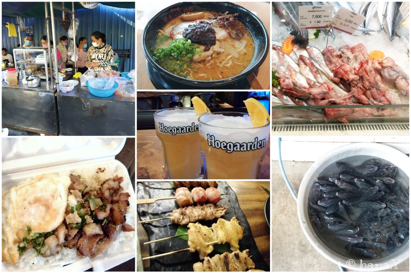 朝の屋台、焼き鳥やラーメンなどの日本食、アルコールはとくにビールが安くて種類が豊富です。スーパーの魚売り場では、写真にあるようにFrog(蛙)も売っています。蛙はチキン様でおいしいのですが、グロテスクな姿から自分で調理したことは、まだありません。