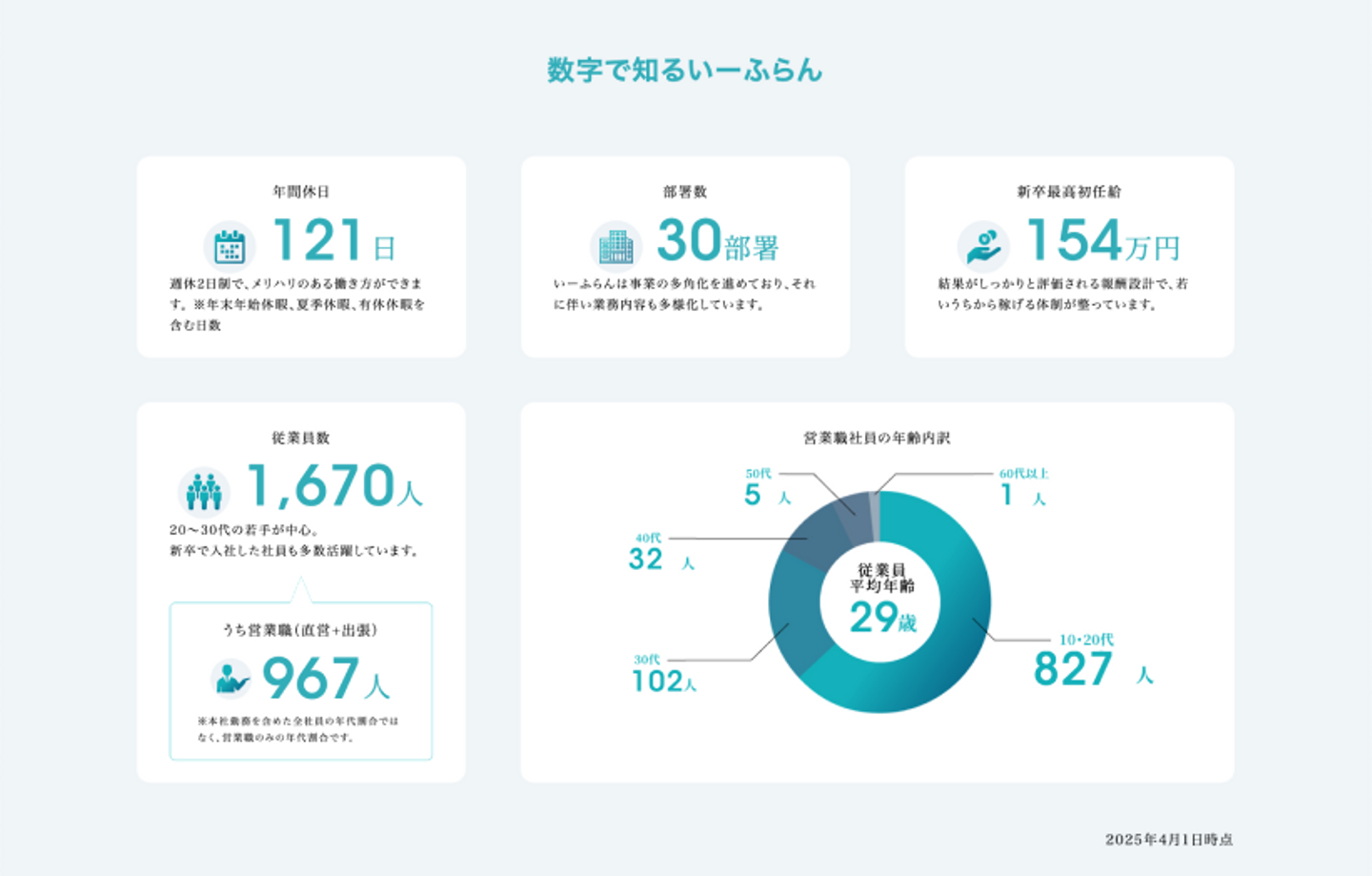 その目標を達成するためには、挑戦心に富んだ若い力が重要と考え、新卒採用に力を入れて取り組んでおります。新しいことに挑み続けるいーふらんでは、新しいポストが次々と生まれ、社歴に関係なく能力次第で活躍できる環境をつくりあげております。