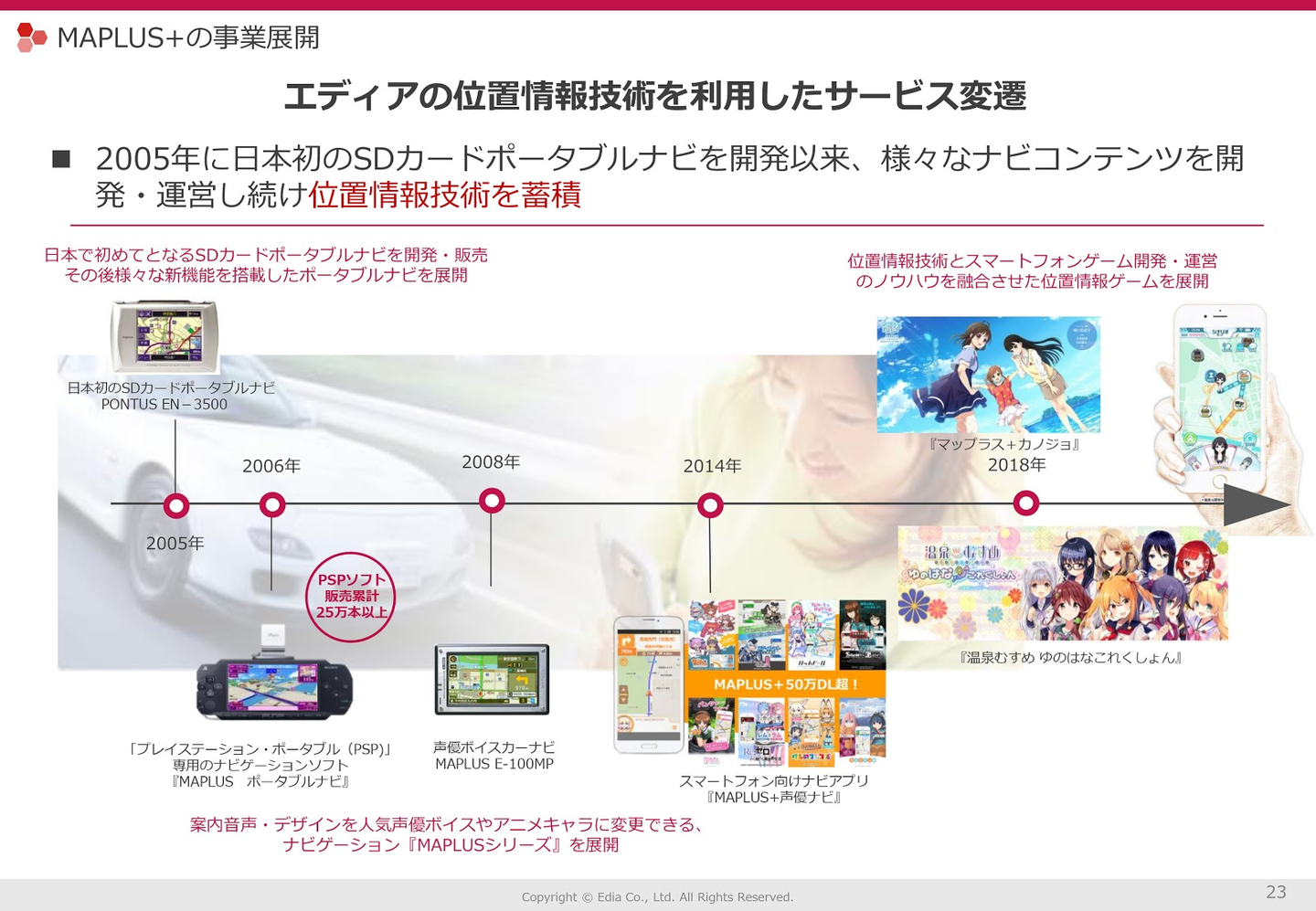 「エディアが今まで培ってきた位置情報の技術を利用したナビゲーションアプリです。MAPLUS+声優ナビではキャラクター等のコンテンツを増加させることによりユーザー数を増加させ収益拡大を図り、機能面を充実させ、スマホナビアプリのNo.1を目指します。また、新たな動的プロモーションとして活用し、人を動かすことで新たなコンテンツを創出していきます。」