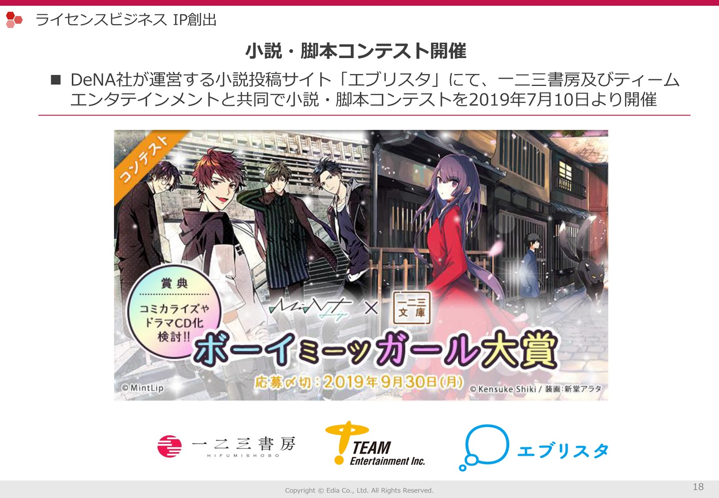 「また、自社IP、共同保有IPを活用し、DeNA社が運営する小説投稿サイト「エブリスタ」にて、一二三書房及びティーム エンタテインメントと共同で小説・脚本コンテストを開催するなど、積極的に活動の幅を広げていきます。」