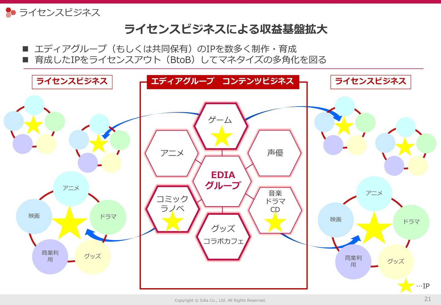 「これまでのようなコンテンツ制作に加え、一つ前でお伝えしたようなIPの制作・育成を積極的に行うことで、エディアグループから日本国内の企業、海外の企業に対してライセンスビジネスを強化していきます。ティームエンターテインメントではオリジナルドラマCDタイトルの販売好調につき、新規シリーズや人気シリーズの続編をリリースしています。こちらも年間50タイトルほどをリリースする予定で、とても活発な事業となっていく予定です。」