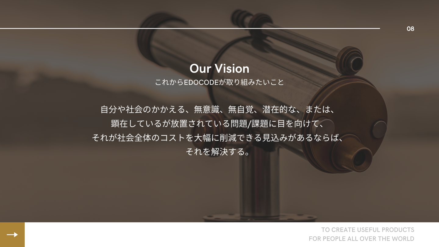 ビジョンについては、以前からイメージしていたものがありました。それは「強みである安定した収益事業基盤のもと、本当に自分たちがやりたいことをやる」ということです。そしてEDOCODEのメンバーにとって“本当にやりたいこと”というのは、自分たちの力で世の中が便利になることでした。「自分たちのサービスが世界中で使われていて、使った人が便利になる」、それを目指したいと思っていました。それをより明確に定義したのが、今回策定したビジョンです。