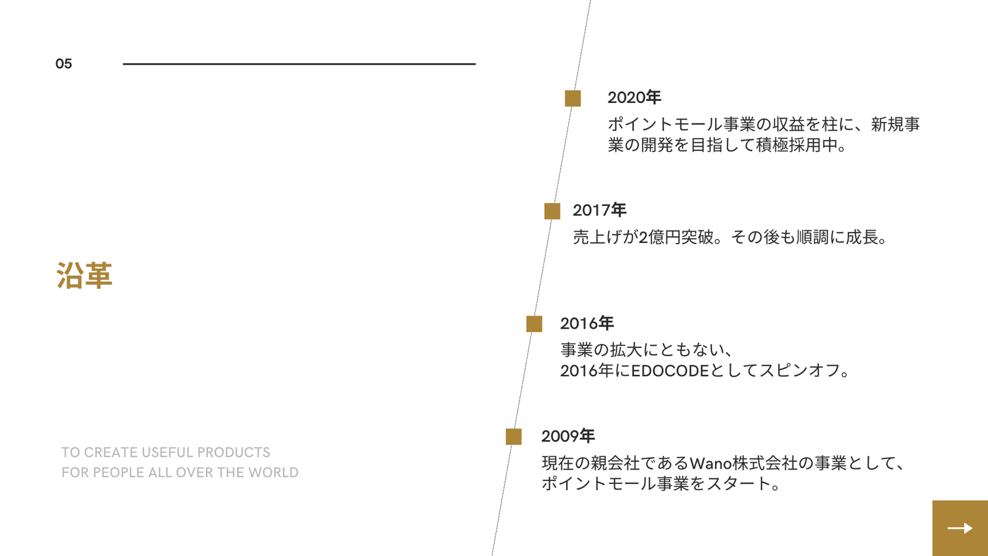 EDOCODEは、Wano株式会社の収益事業であるポイントモール事業が大きくなり、2016年にスピンオフした会社です。スタート以来、ポイントモール事業を安定して成長させることができており、次のチャレンジとして「ポイントモールを収益の柱としつつ、新規事業をつくる」ことを考えています。