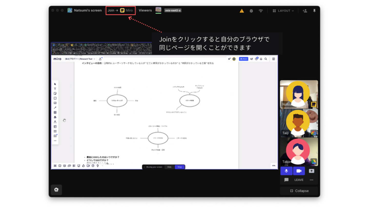 また参加者が開いているWebアプリやページをワンクリックで入れる機能もあります。他のツールだとURLが共有されるのを待つしかなく受動的ですが、Tandemでは入りたいと思ったら自分から能動的に相手の開いているアプリやページに”Join”することができます。