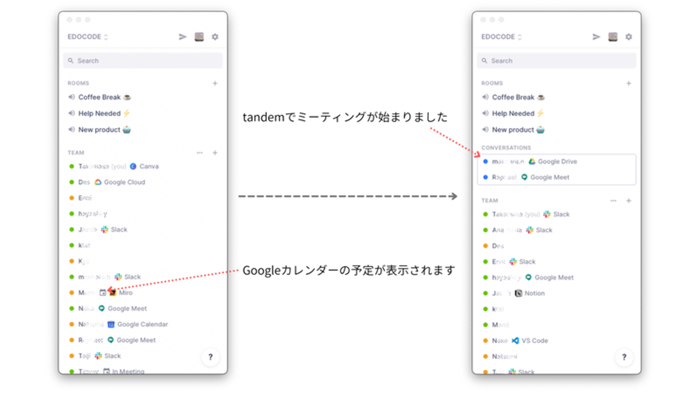 Tandemを使うと、メンバーのステータス確認が容易です。オンラインであればグリーン、非アクティブであればオレンジとステータスアイコンの色が変わるのはもちろんですが、Google Calenderと連携することで予定が入っているかも表示されます。