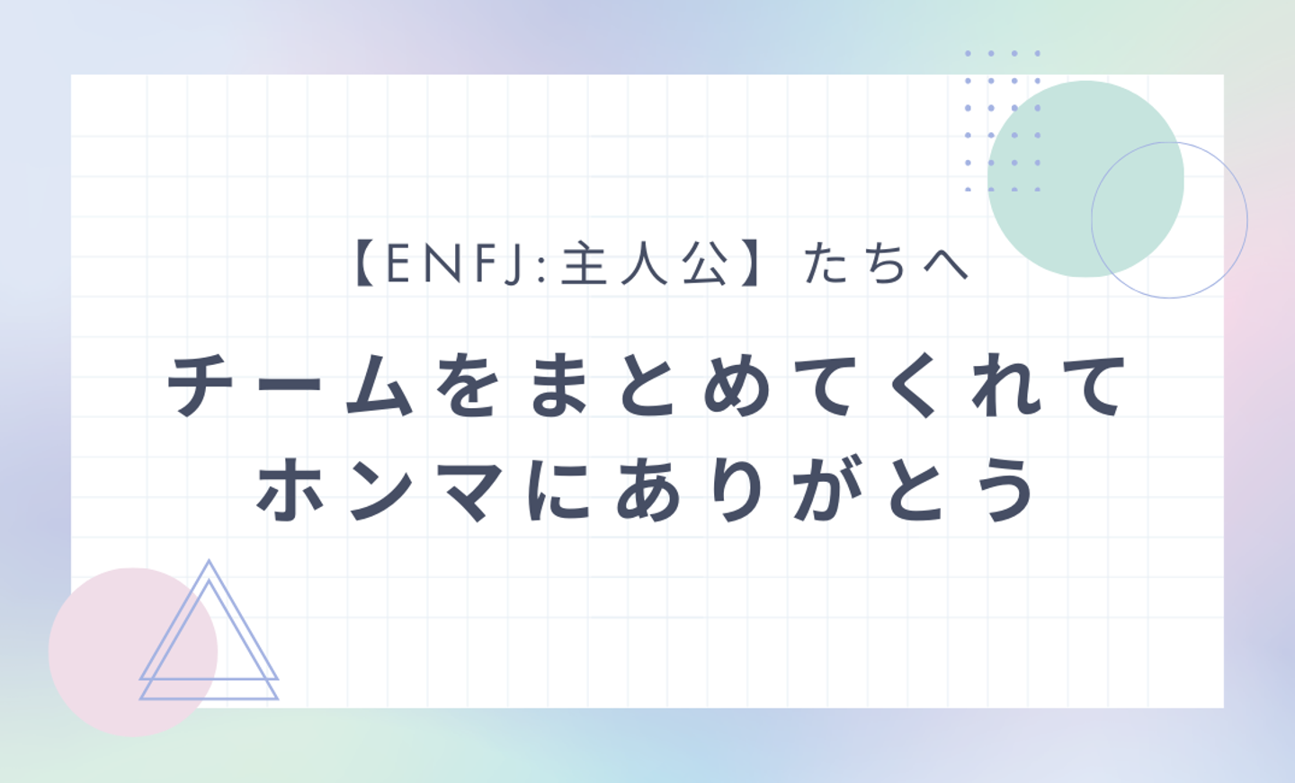 【ENFJ: 主人公】は、思いやりにあふれ、チームの士気を上げるのが得意なタイプで、 「みんなで頑張ろう!」「これ、君ならできるよ!」と自然に言えてしまう、ムードメーカー&牽引役。周囲を巻き込んでアクションを進めたり、新メンバーもすぐに馴染めるように場を温めるなど、ファシリテーター的な役割を任されがちです。