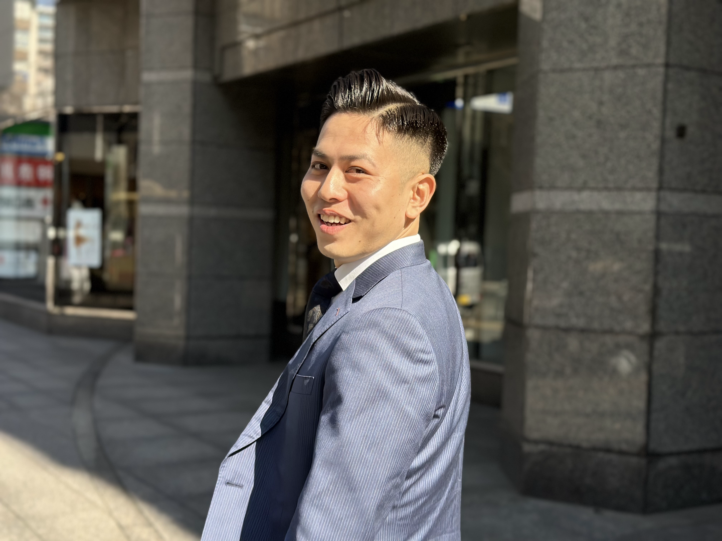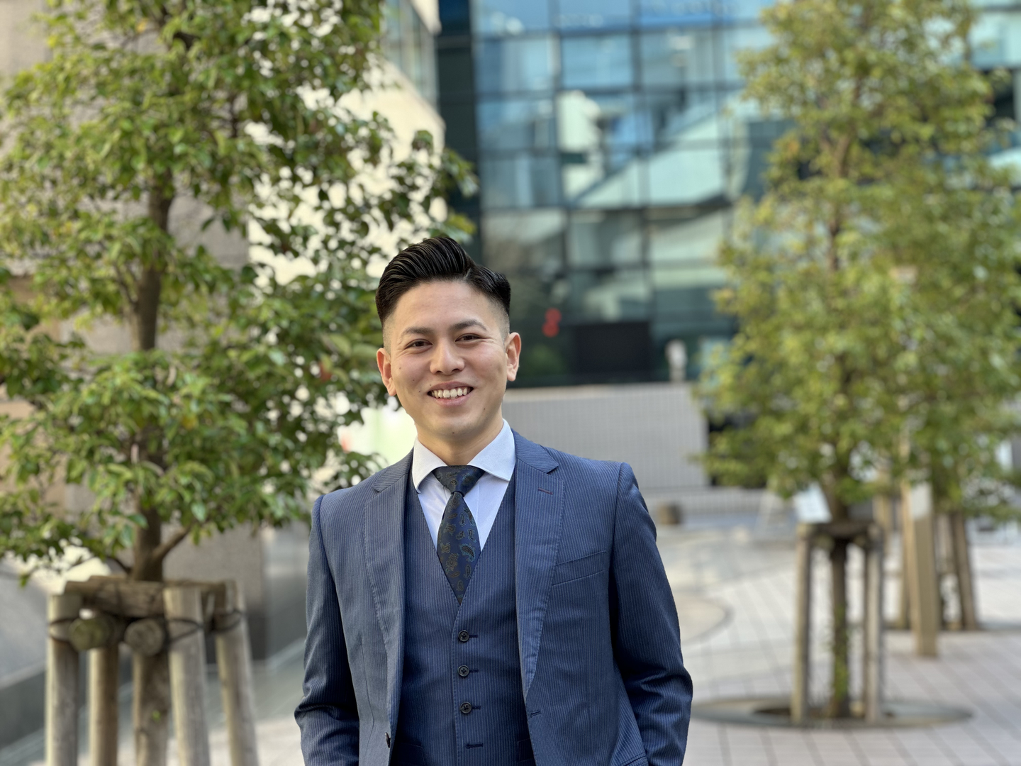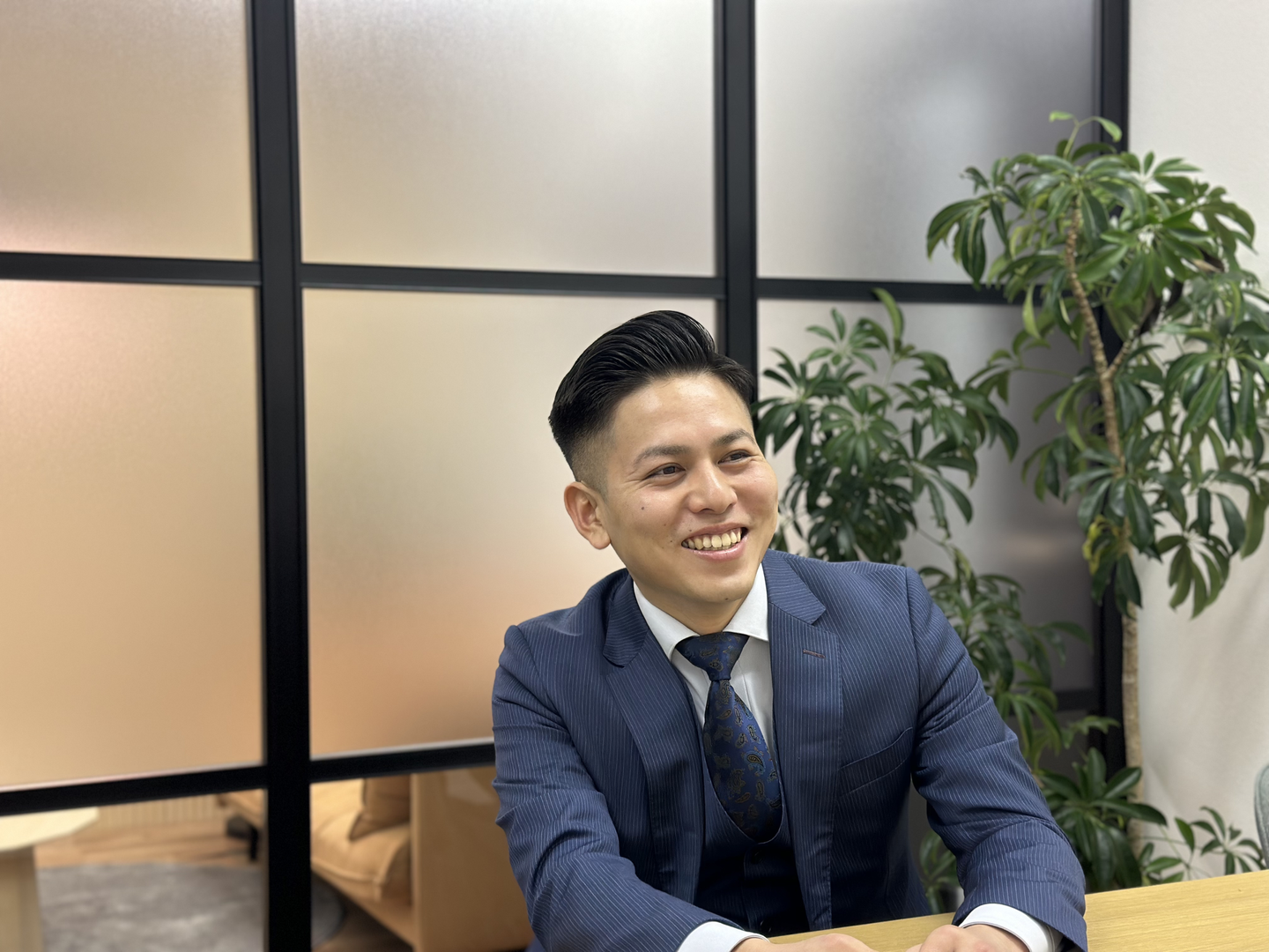 趣味はサウナ、旅行、映画鑑賞。この日のために美容院で髪型を整え、コーディネートもばっちり整えて来てくれました!先輩に協力してもらい、インタビューのシュミレーションもしてきたとのこと。嬉しい。整ったお顔と目力が一見強面な印象ですが、実は社内のムードメーカー的存在でもあり、彼がいるだけで社内がパッと明るくなるような、そんな素敵な魅力を持っている方です。ぜひ一度会っていただきたい。