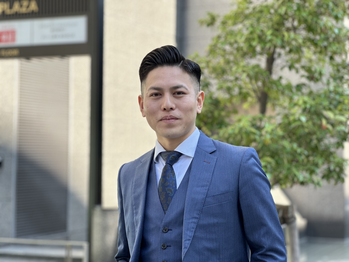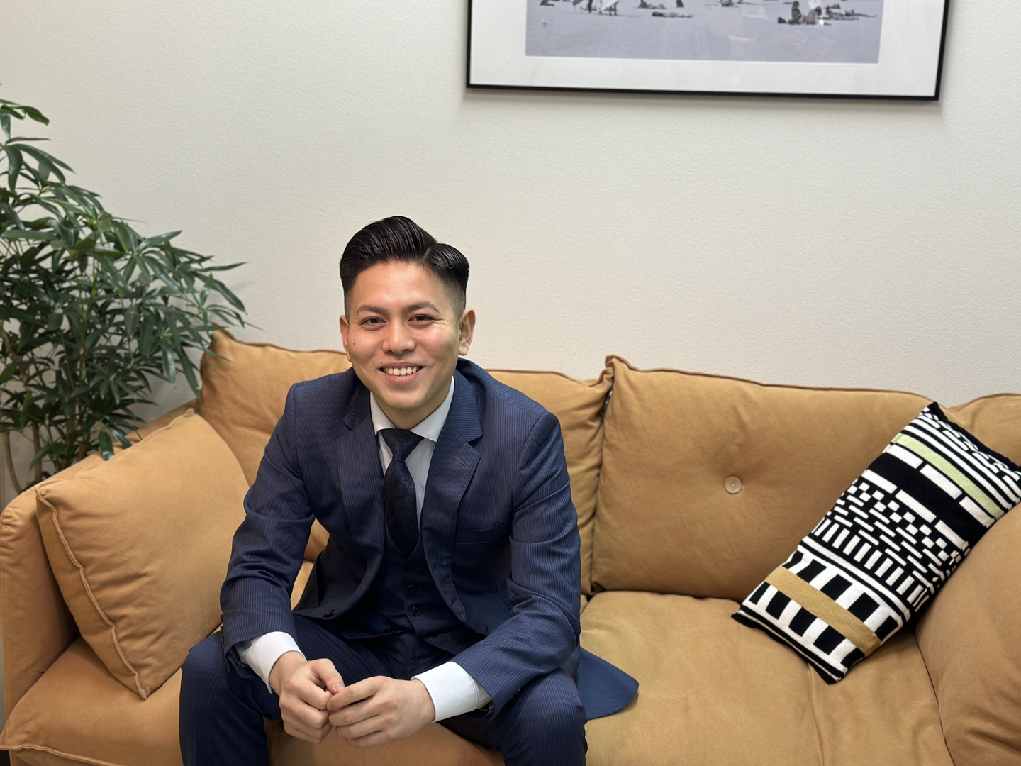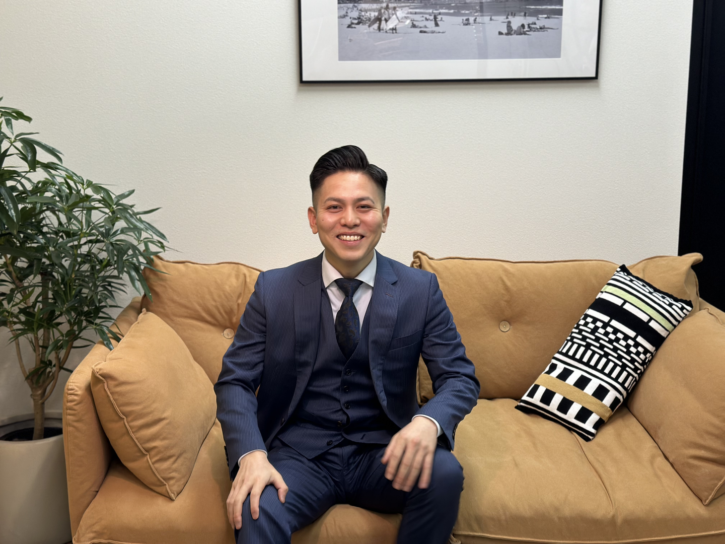 趣味はサウナ、旅行、映画鑑賞。この日のために美容院で髪型を整え、コーディネートもばっちり整えて来てくれました!先輩に協力してもらい、インタビューのシュミレーションもしてきたとのこと。嬉しい。整ったお顔と目力が一見強面な印象ですが、実は社内のムードメーカー的存在でもあり、彼がいるだけで社内がパッと明るくなるような、そんな素敵な魅力を持っている方です。ぜひ一度会っていただきたい。