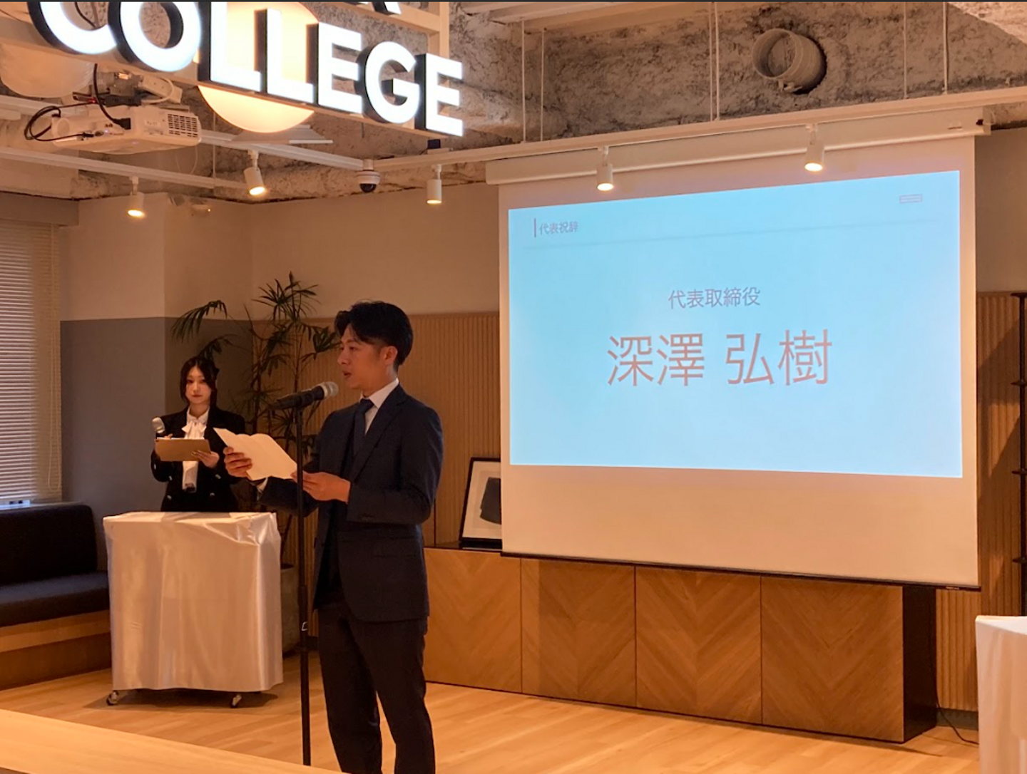 まずは代表取締役社長深澤さんから新入社員へ激励を込めた温かいメッセージが送られました。