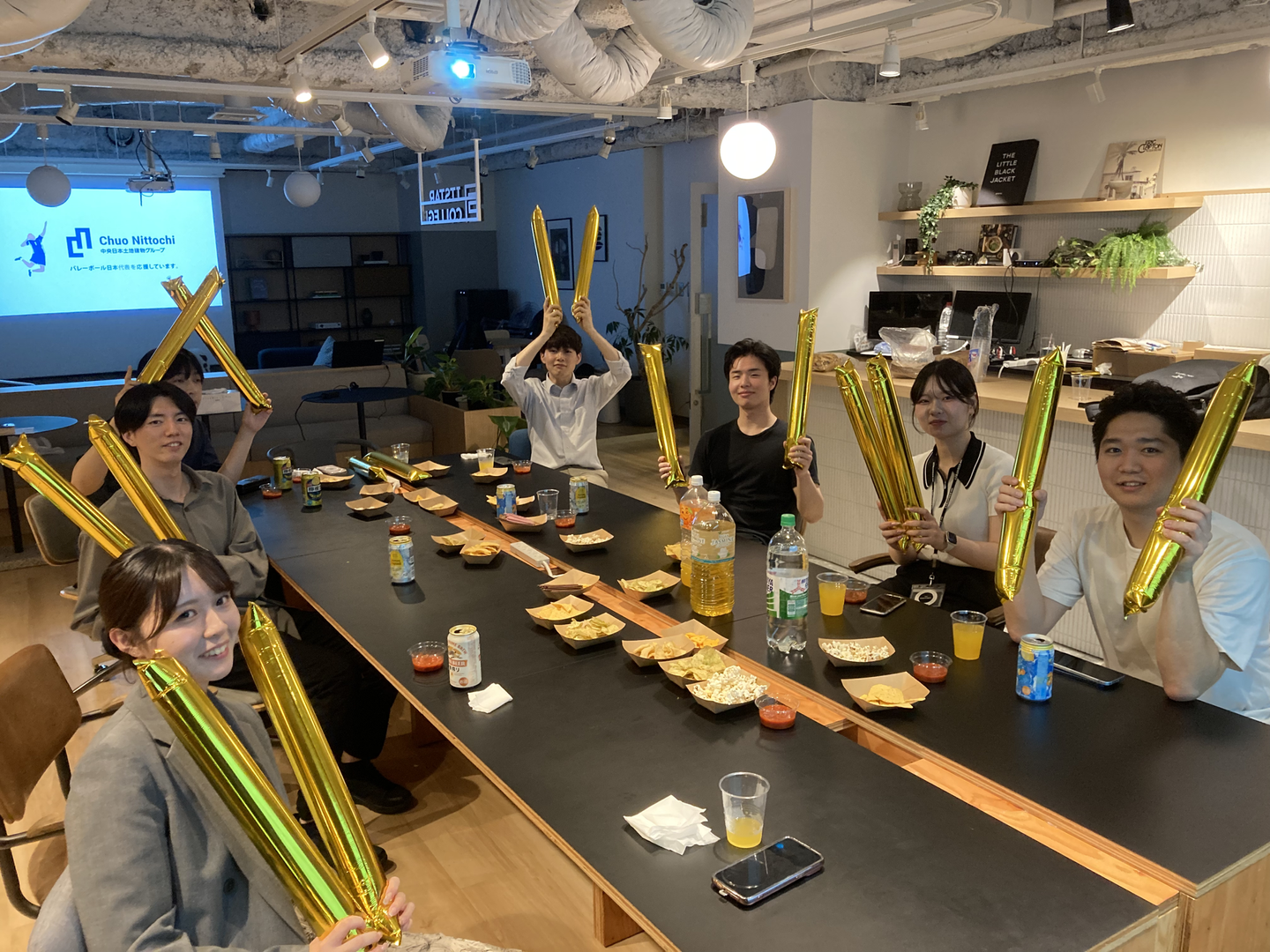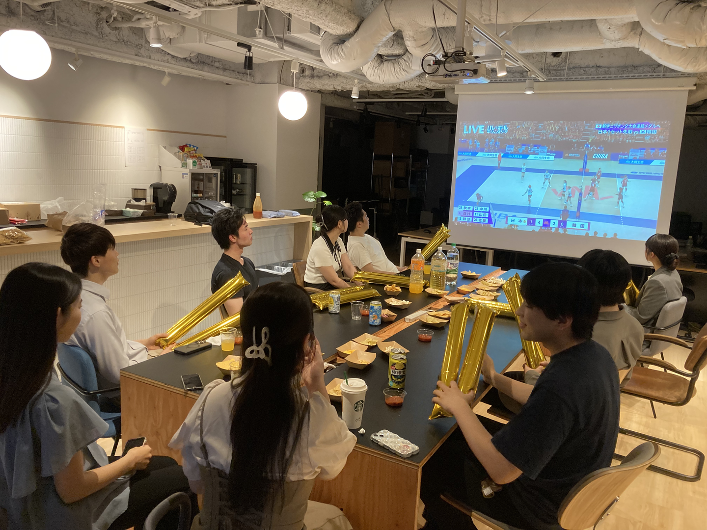 観戦イベント当日、研修室には大きなスクリーン、照明を暗くし、ポップコーンやサルサアンドチップスが用意されて、研修室はパブのような雰囲気に✨ 参加メンバーは新卒〜入社5年目まで社歴も現場もさまざまな方がで、初対面同士の人も多かった一方で同期で参加してくださっている方もいました!バレーボールの試合が始まると、一気に距離が縮まりました。