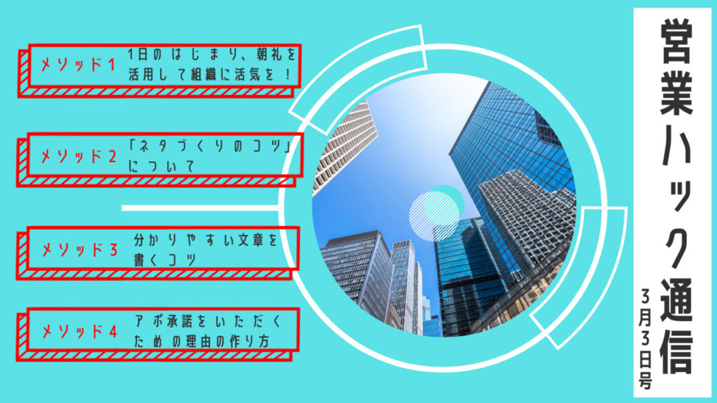 ただ、何年も同じメンバーで同じ内容で朝礼を続けているとマンネリ化して、何が目的なのかわからず、憂鬱になってくるメンバーも出てくるのが朝礼の側面でもあります。今日は良い朝礼について営業ハックがしていることを共有させていただき、少しでも皆様の組織での朝礼活性化のヒントになれば良いなと思います!
