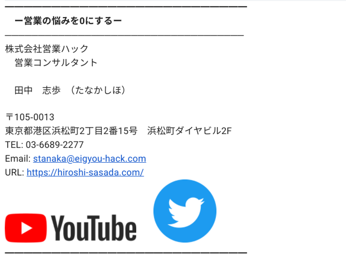 営業でSNSを活用する方法として例えば私なら。メールの署名に連絡先+個人のTwitterと代表笹田のYouTubeを貼っています(スクショ参照↓)
