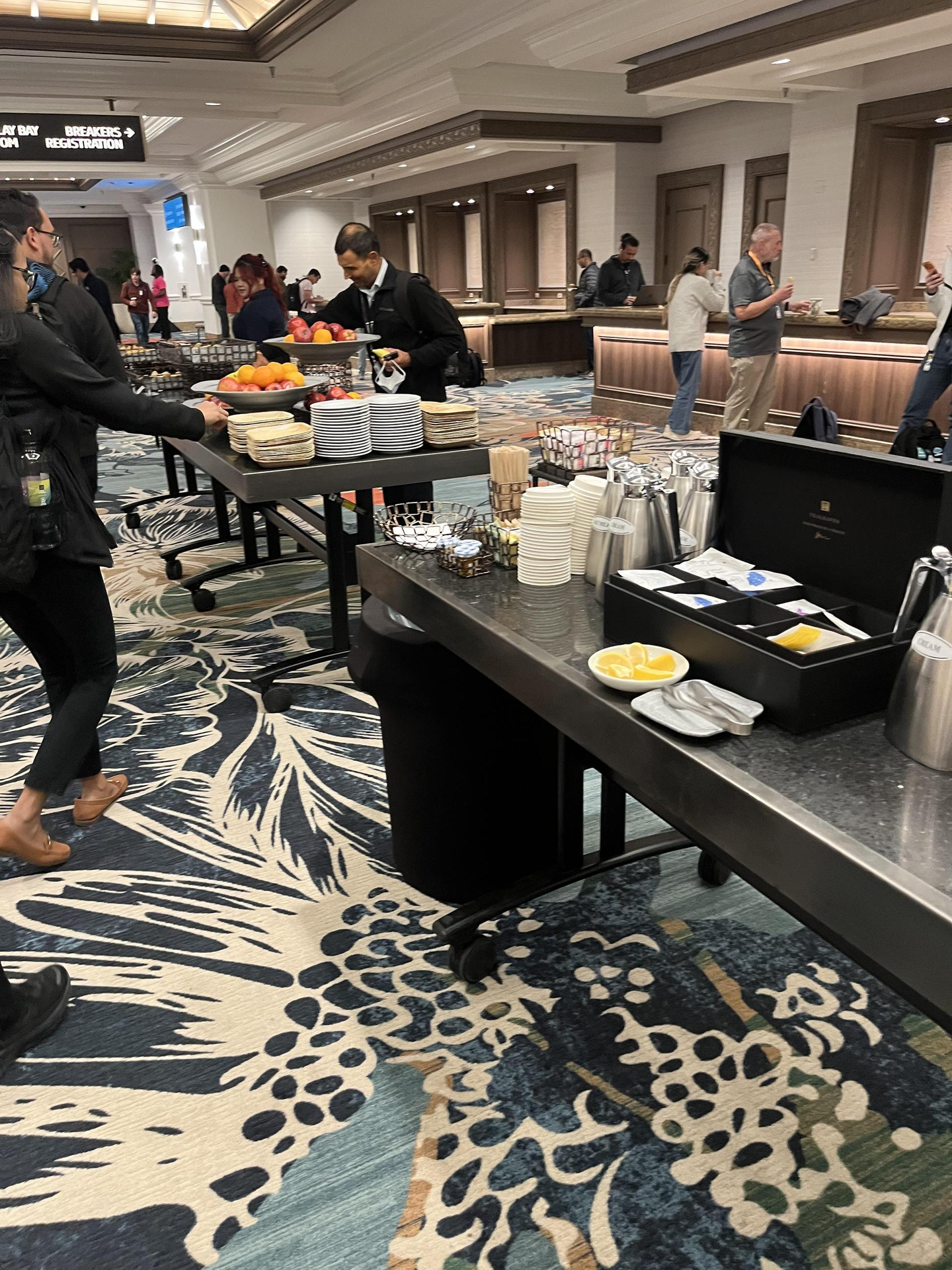 ホテルの廊下にコーヒーや軽食などが用意されており、セッションの合間に一息つくことができる