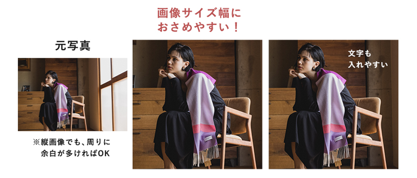 様々な形のバナーを作成したり、商品ページで写真の形を変えたりして使用したいことは多々ありますよね。その際、横幅が足りないともうにっちもさっちもいきません。中途半端にモデルの頭が切れている場合も同様ですし、横幅が広いPC版のデザインが必要な場合は特にデザインに困ることになります。