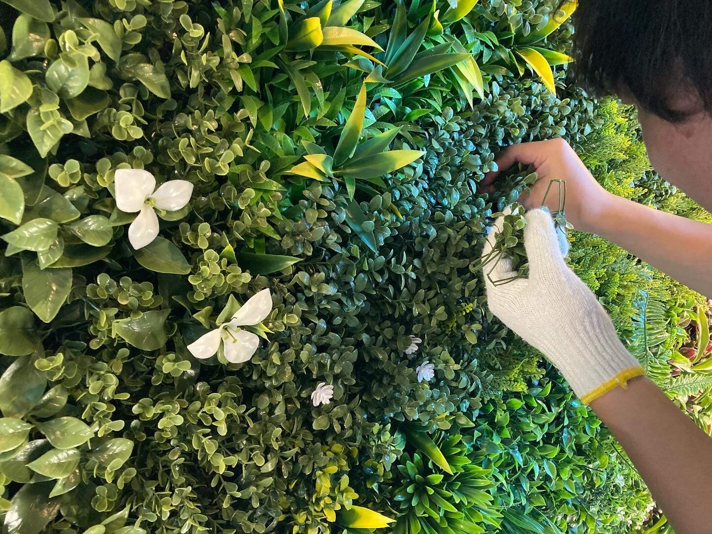 まずエレベーターを降りると、どーんと目に入るのがフェイクグリーンの壁。