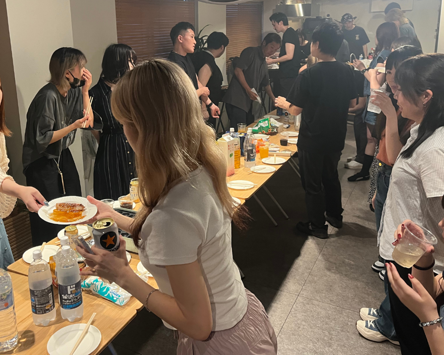 準備チームが焼きそば、お菓子、おつまみを準備し、参加者たちはそれらをつまみながら談笑。あらかじめ用意されていたお酒やジュースを片手に、食事を楽しむ時間が続きました。