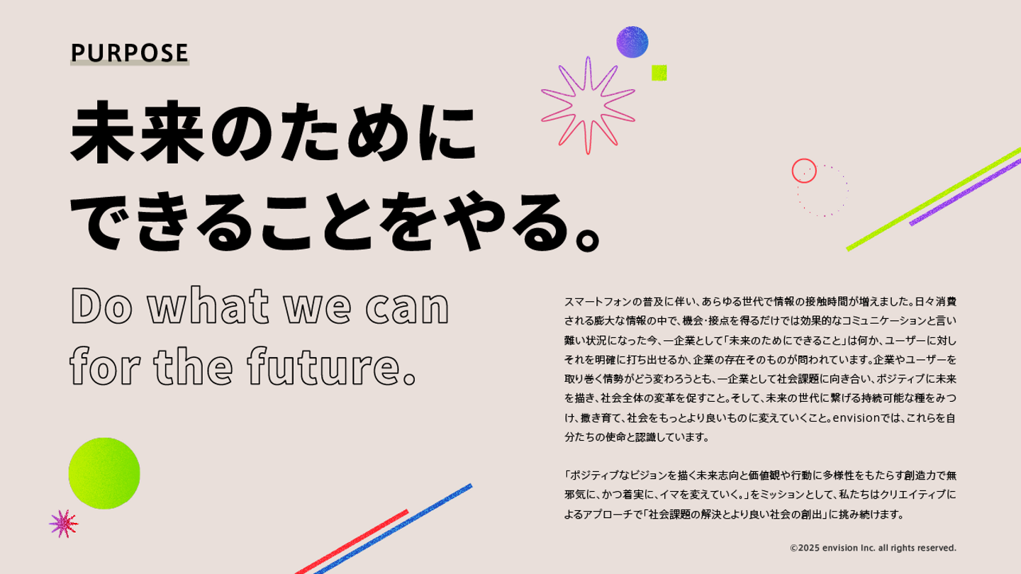 エンビジョンは、「未来のためにできることをやる。」をパーパスに掲げ、パートナー企業の経営・事業・組織課題を社会課題と紐づけ、ブランディング×クリエイティブで解決していくクリエイティブコンサルティング会社です。