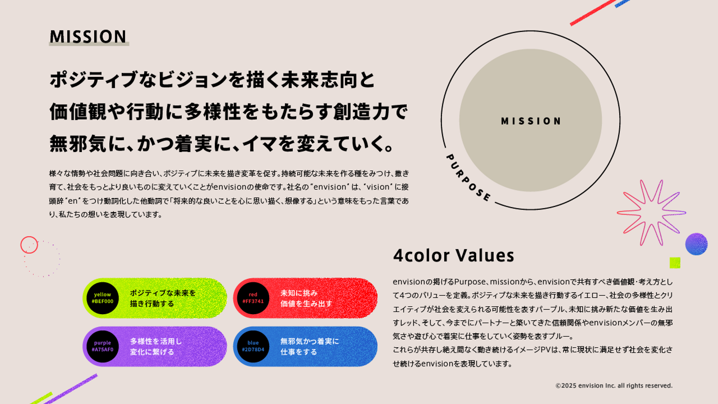 株式会社エンビジョンの採用情報です。エンビジョンのパーパス、ミッションに賛同し、共感と共創の環を拡げ、ブランディング×クリエイティブによって、世の中の複雑かつ未だコンセンサスのとれていない課題を解決していくメンバーを募集しています。