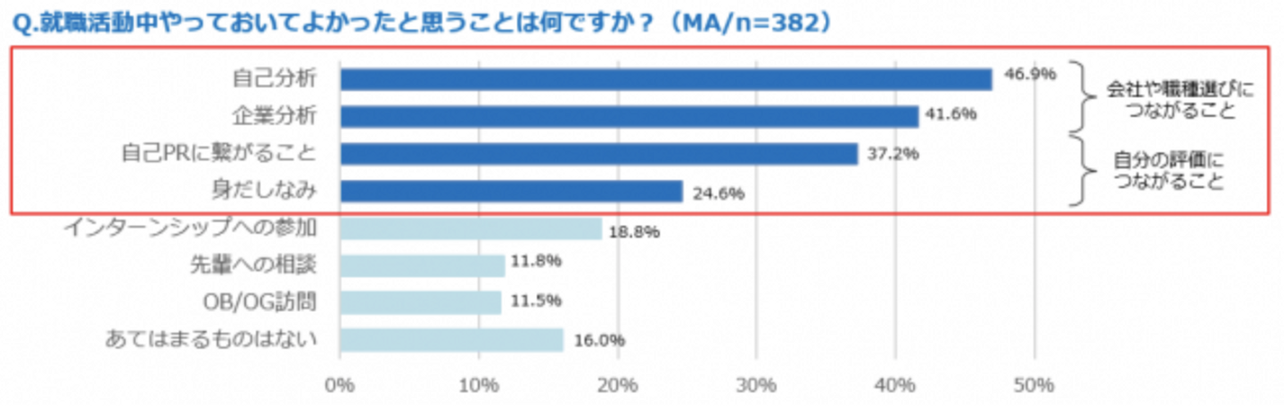 - 就職活動で「もっとやっておけばよかった…」と後悔していることは、「企業分析」と「自己分析」!