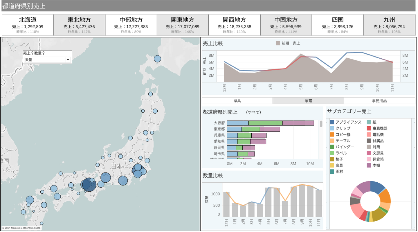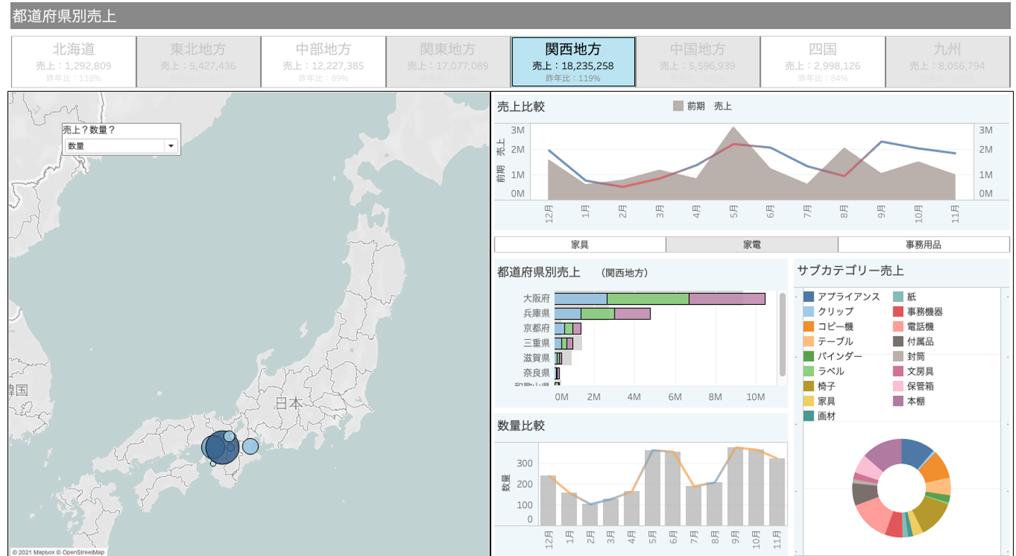 先程のダッシュボードから地域を特定し、更にドリルダウンして都道府県別や製品カテゴリーの売上動向を閲覧できるように作成しました。このダッシュボードでは4つ目のポイントであるフィルター機能を地方名で使っています。地域を選択すると、県別で売上・数量の推移や商品の売上動向を分析することができます。