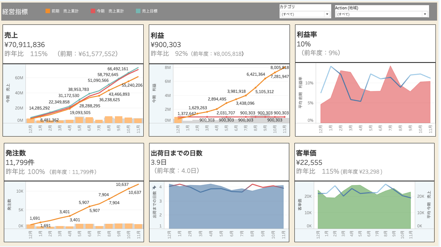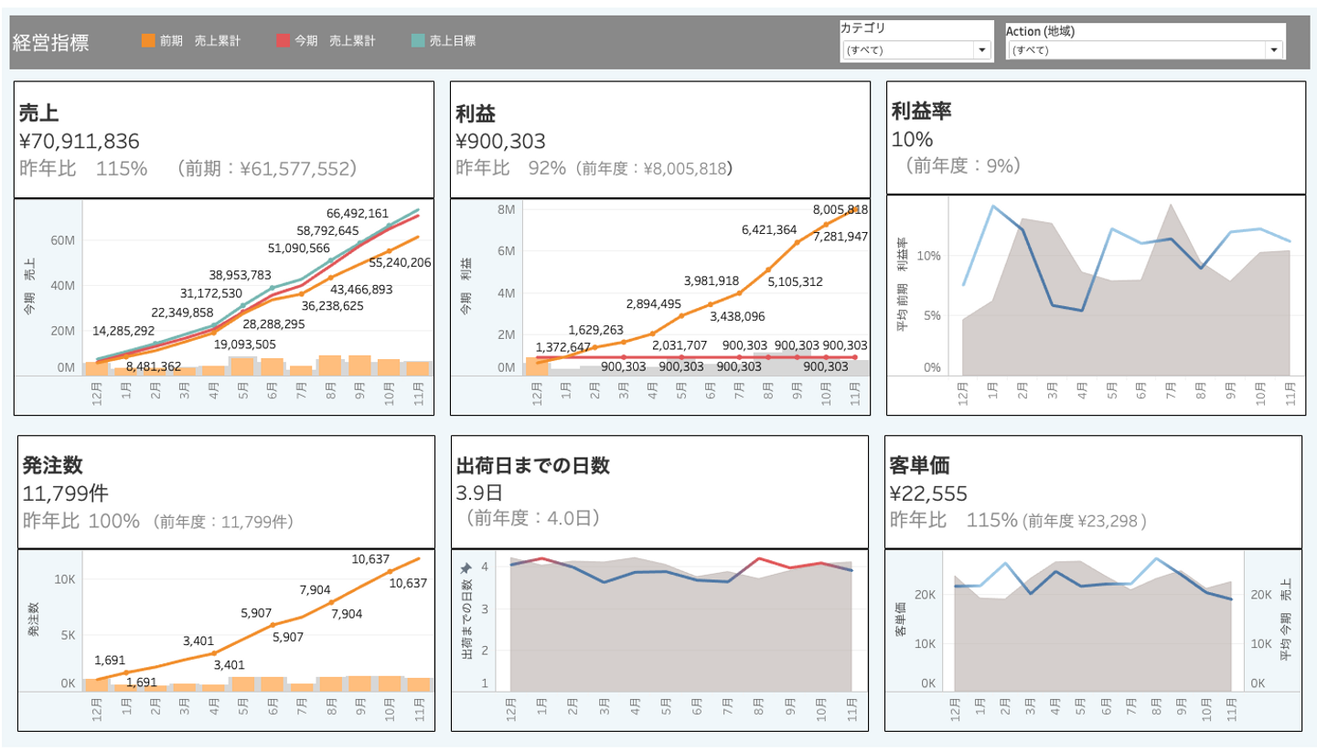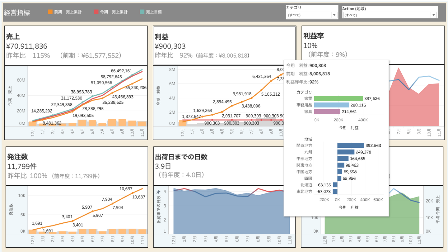 使用目的は毎月の定例報告で、部長クラスの方が閲覧すると想定して作成しました。このダッシュボードのポイントは各指標をテキストと推移を示すグラフでまとめているところです。また、各指標にツールヒントでカテゴリ別や地域別の指標を示しているためドリルダウンすべきカテゴリーを見ることができるようにしました。また、右上にフィルターを設けることで、指定したカテゴリの指標推移を閲覧することも可能です。