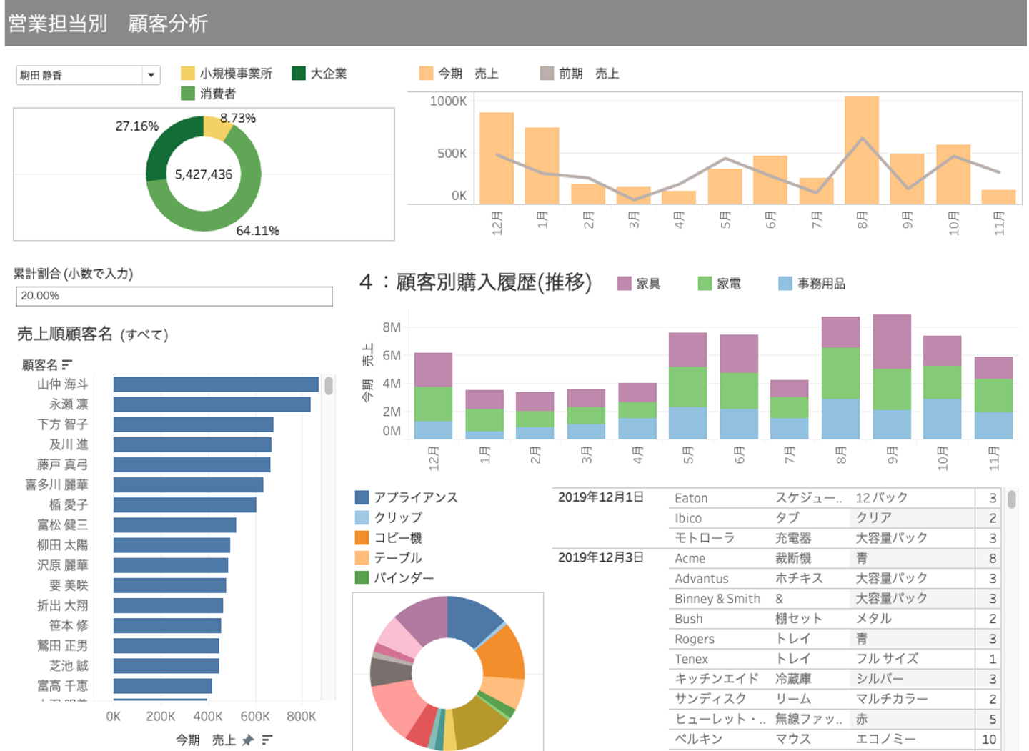 使用する人が営業担当の場合、自分が担当する顧客の売上推移や一番購入している製品は何かを分析することで、顧客のニーズに合わせた商品提案に結びつける必要があります。