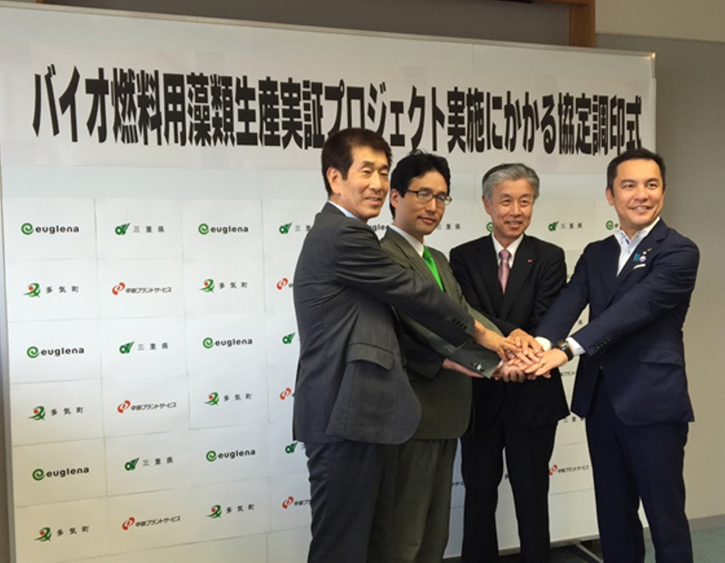 ユーグレナ社は、中部プラントサービス、三重県、多気町の協力のもと、木質バイオマス発電所より、排出される排ガス・排水・排熱などを微細藻類の培養に必要な二酸化炭素源やエネルギーとして用いる燃料用微細藻類培養プールを木質バイオマス発電所の隣接地に建設することを発表した。