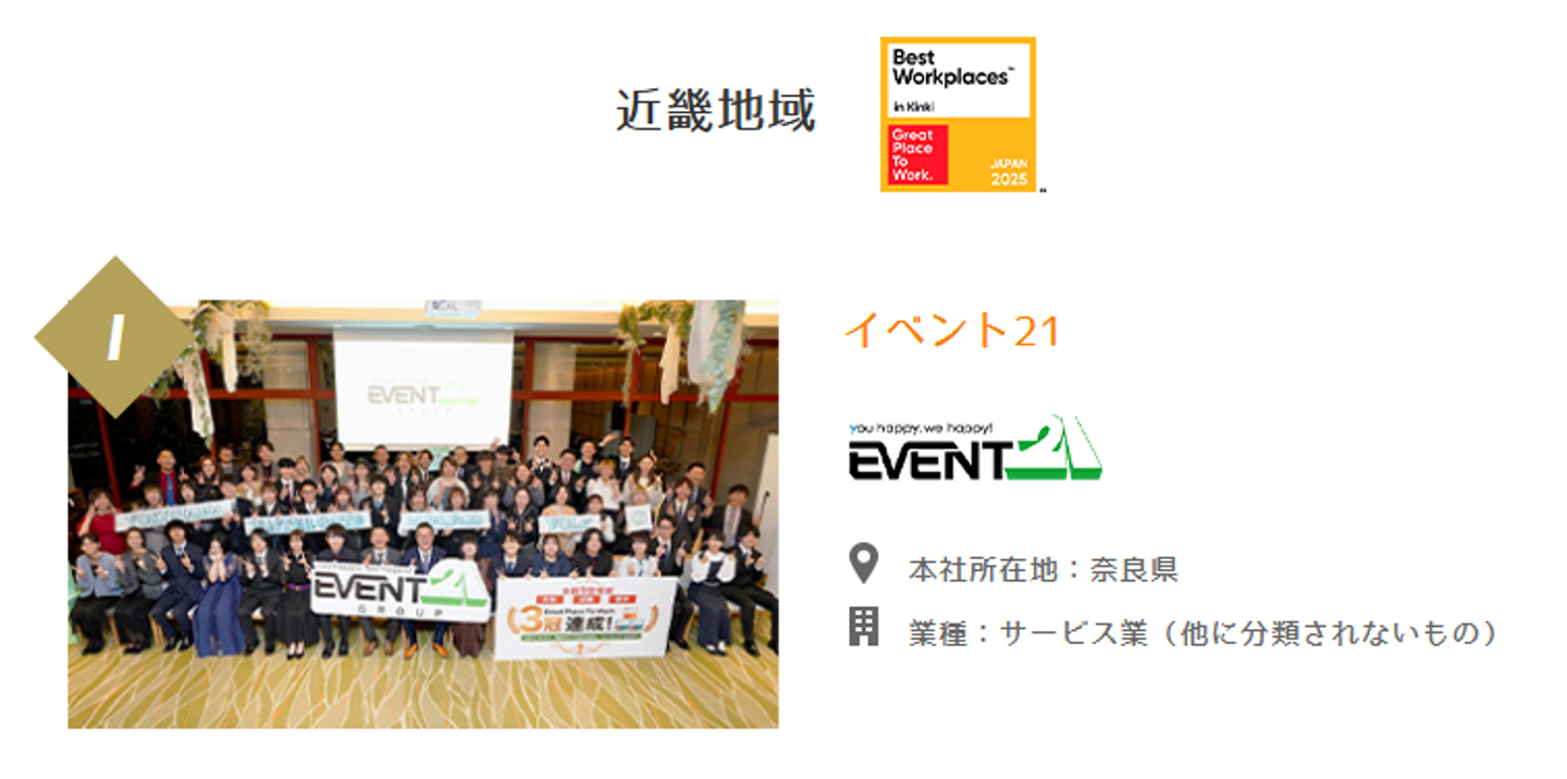 なんとイベント21が「2025年版 各地域における『働きがいのある会社』ランキング」にて、第一位に選ばれました🎊🎊🎊