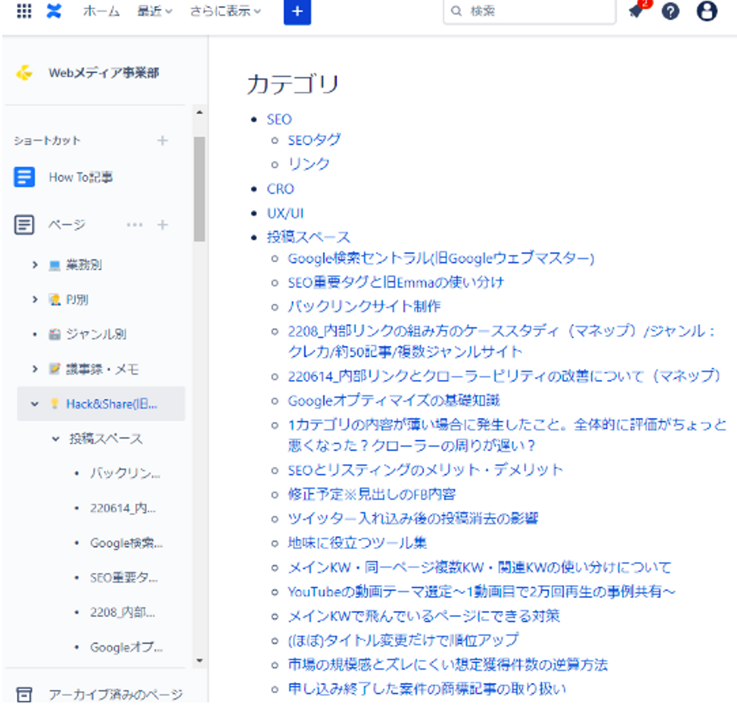 実際にWebメディア事業部で活用しているConfluenceの画面