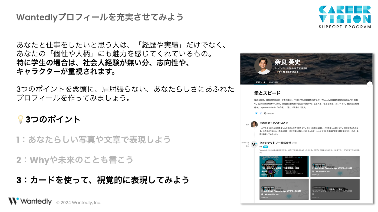 〈詳しいプロフィールの書き方はこちら↓〉 https://www.wantedly.com/stories/tags/WantedlyQS