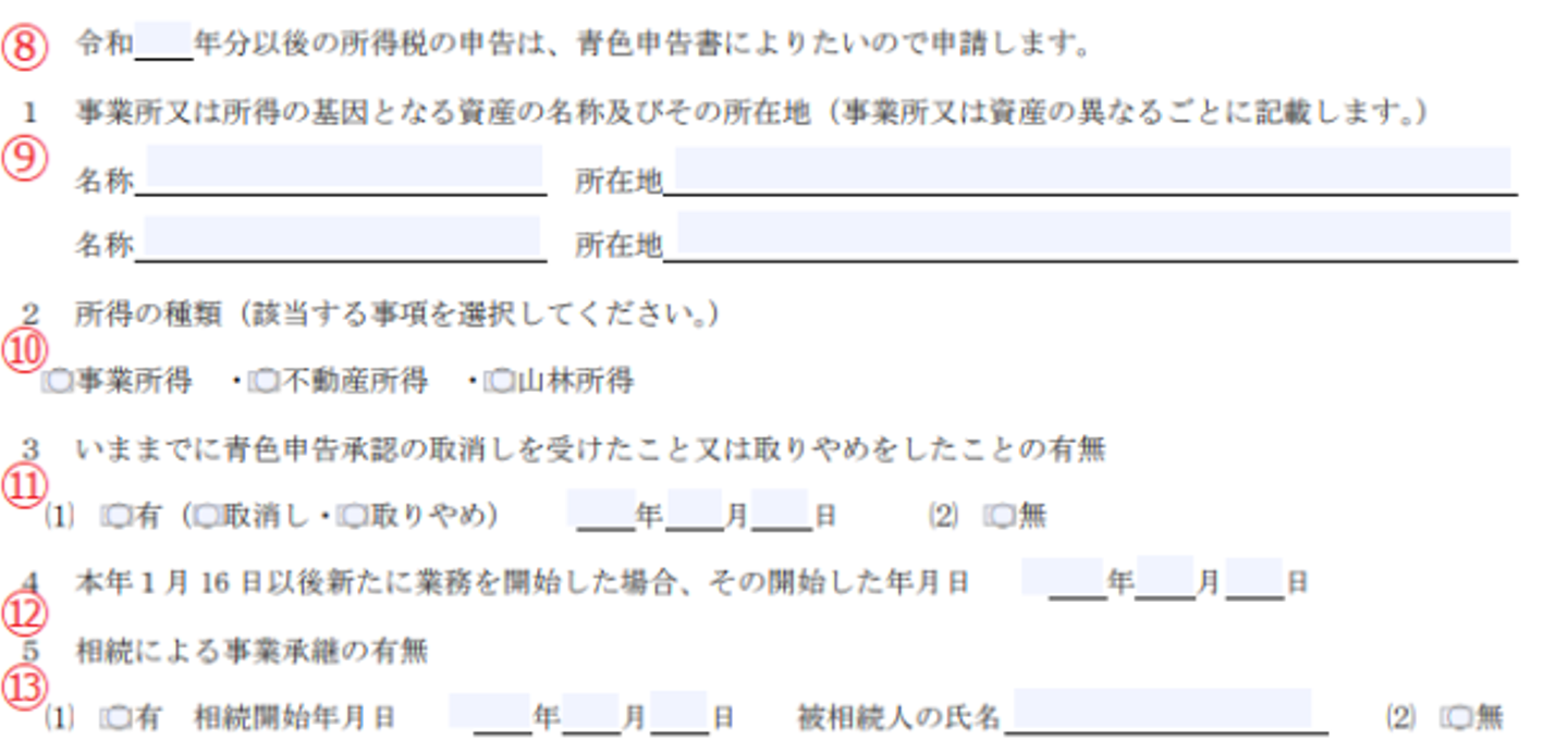 ⑧令和_年分以後の所得税の申告は、青色申告によりたいので申請します。