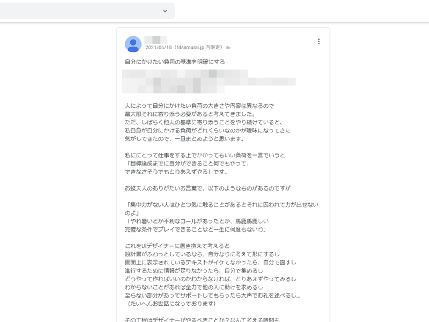 次は、デザイナーのOさん(先ほどとは別の人)の投稿。「自分にかけたい負荷の基準を明確にする」というテーマで、「エースをねらえ!」に出てくるお蝶夫人の言葉を引用しながら、UIデザイナーとして仕事上でかかってもいい負荷を言語化しています。