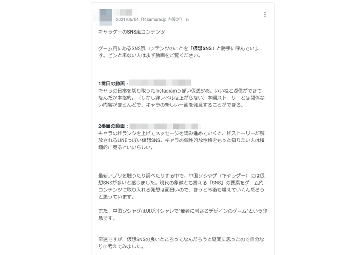 デザイナーのOさんの投稿です。複数のゲーム内にあるSNS風コンテンツを紹介していました。Oさんはそれを「仮想SNS」と呼んでいて、ゲームによってはLINE風のSNSや、インスタ風のSNSがあったりするそうです。仮想SNSへ投稿することで、ゲームキャラクターと仲良くなることができるとのこと。