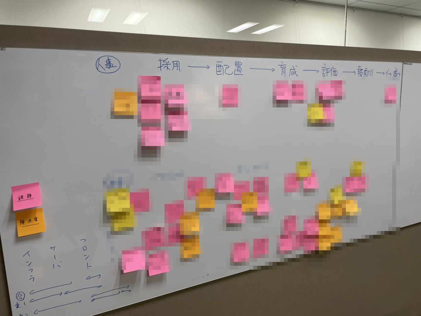 それぞれが付箋に書き、ホワイトボードに貼り出しながら説明、それを聞いて関連する課題があったらそれも貼り出す、という形で進めます。