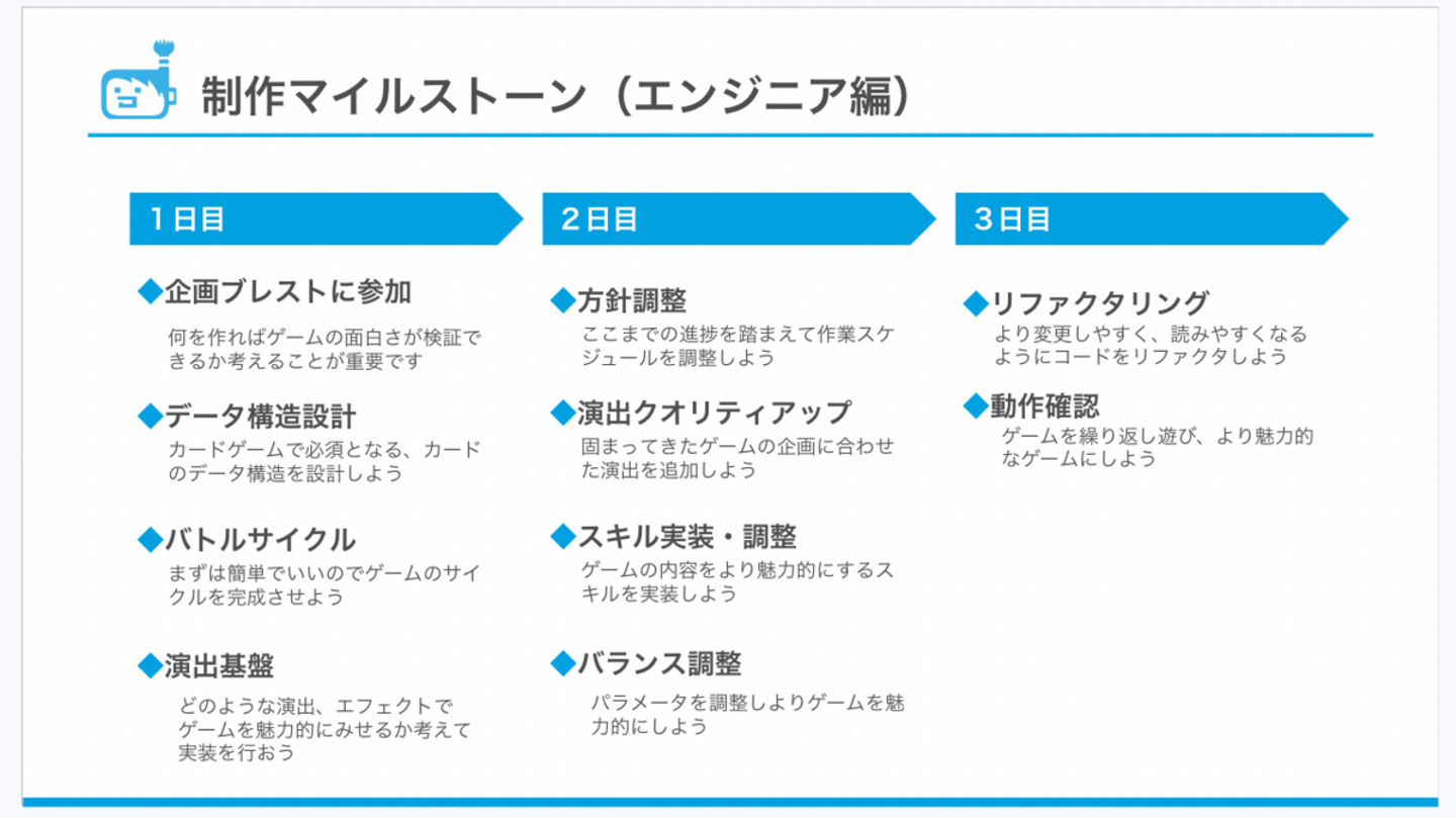 特に、ゲームを開発するエンジニアとして意識してもらいたいのは、スケジュールを意識し、期間内に要望を実現することです。