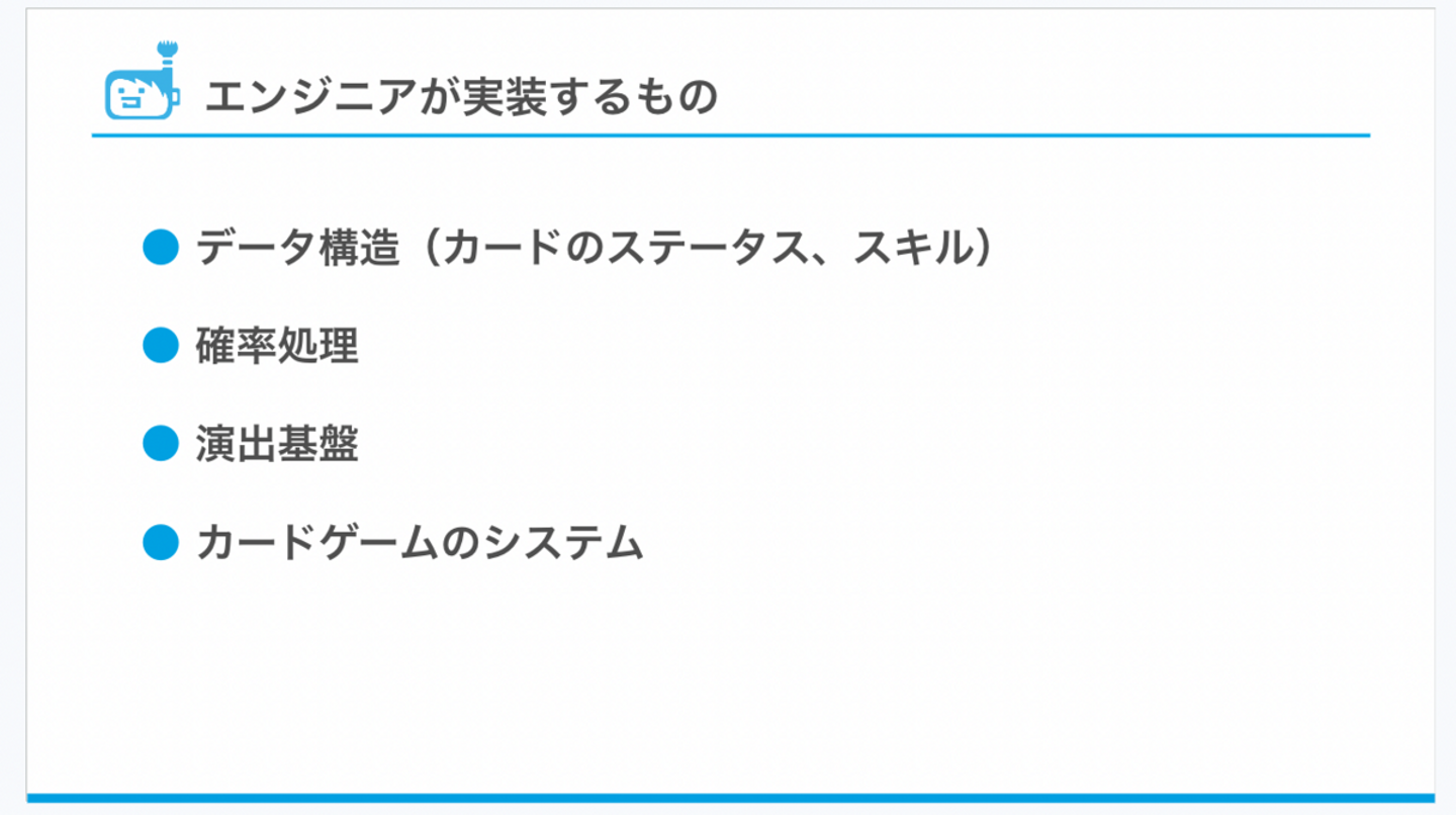 「データ構造」は、プレイヤーやエネミーのHP、カードの攻撃力、スキルなどゲームのベースになるものです。まずは構造化されたシンプルなデータを用意することで、思考の整理ができ、作るものが明確になってきます。