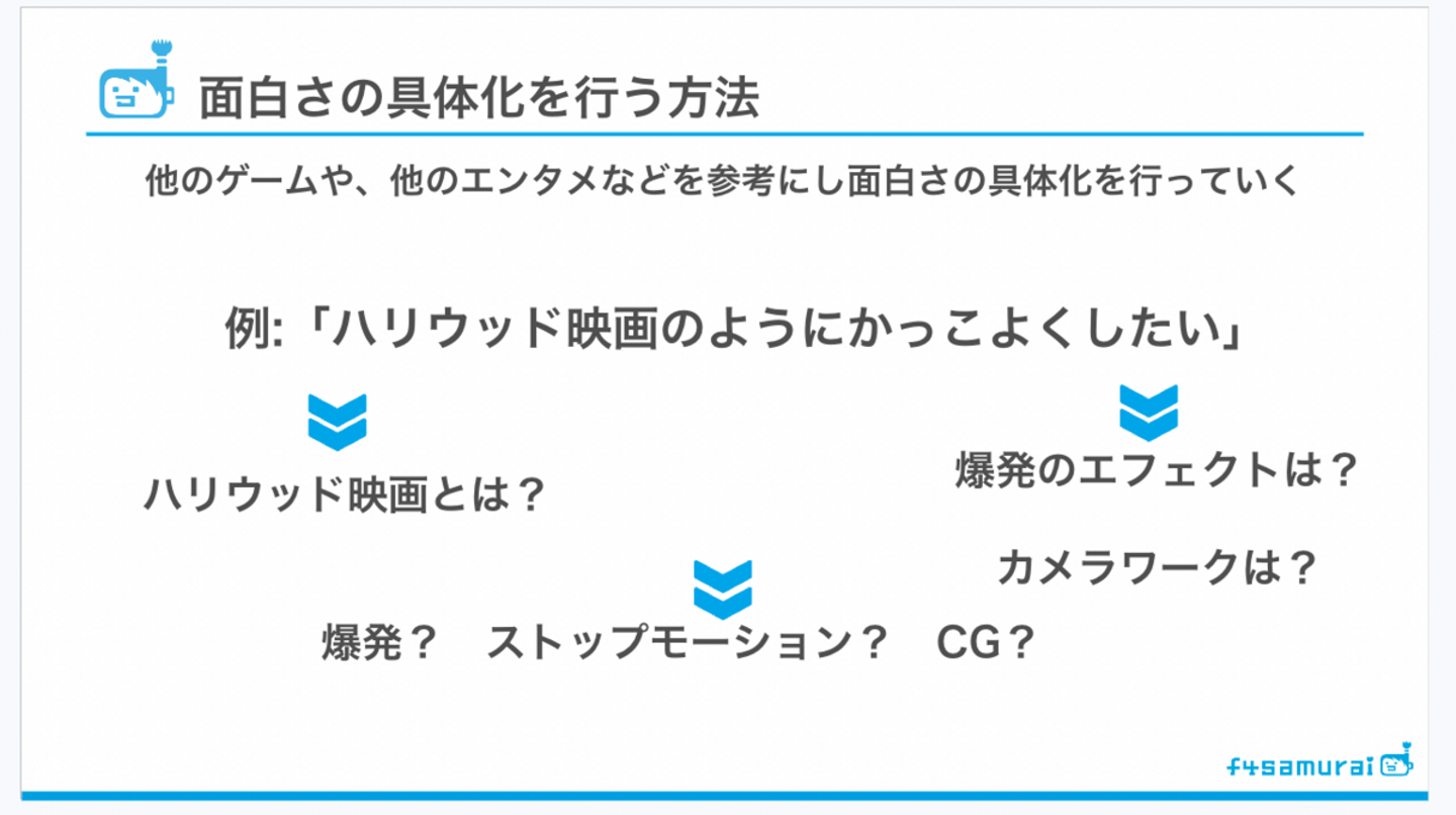 そのようなとき、例えば下記の「ハリウッド映画のようにかっこよくしたい」といった漠然とした提案に対して、要素を分解して言語化し、作業にまで落とし込んでいくことができれば、開発が前に進むといった話をしました。