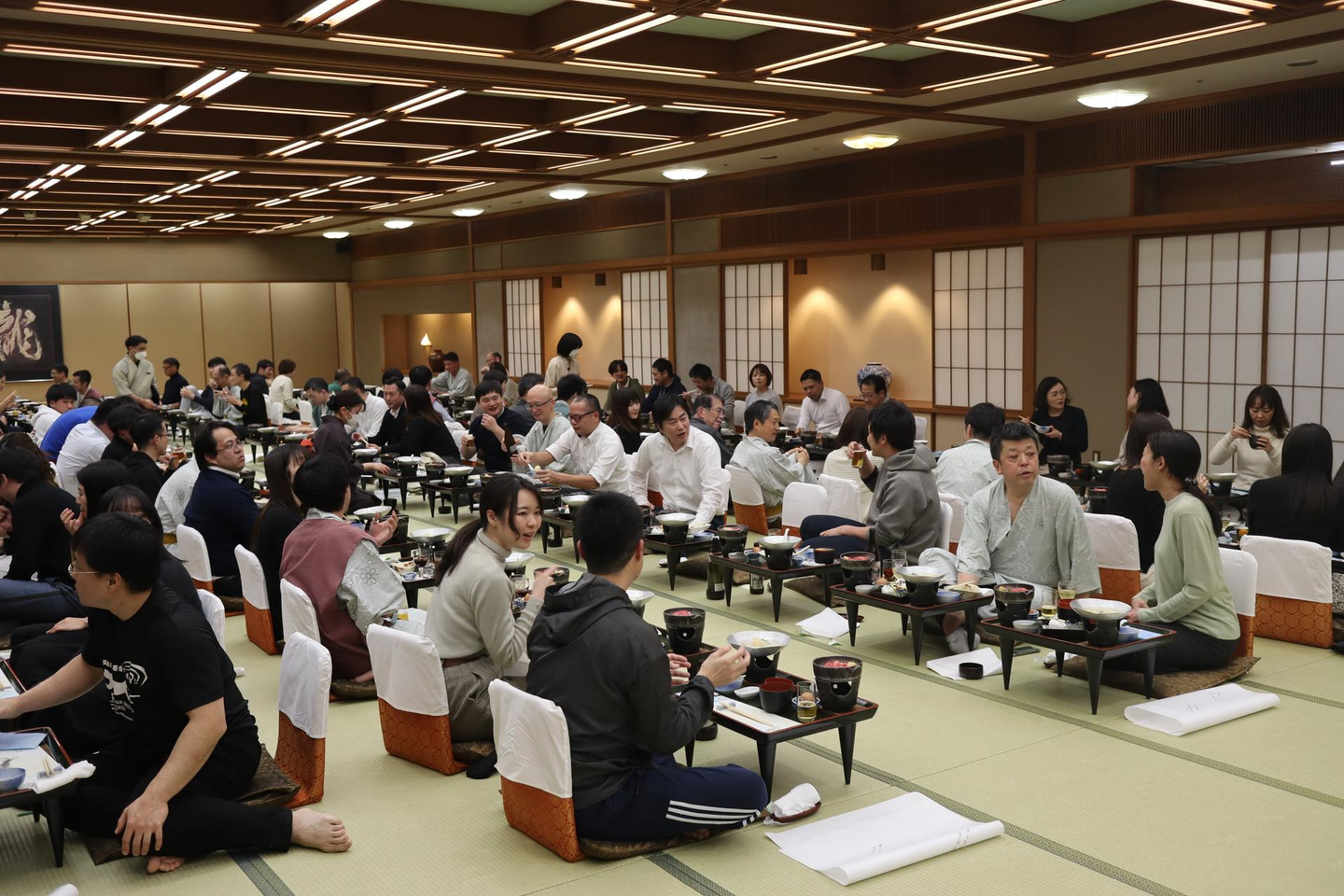 お部屋で少し休憩した後は、宴会場にて全体の宴会が始まります。
