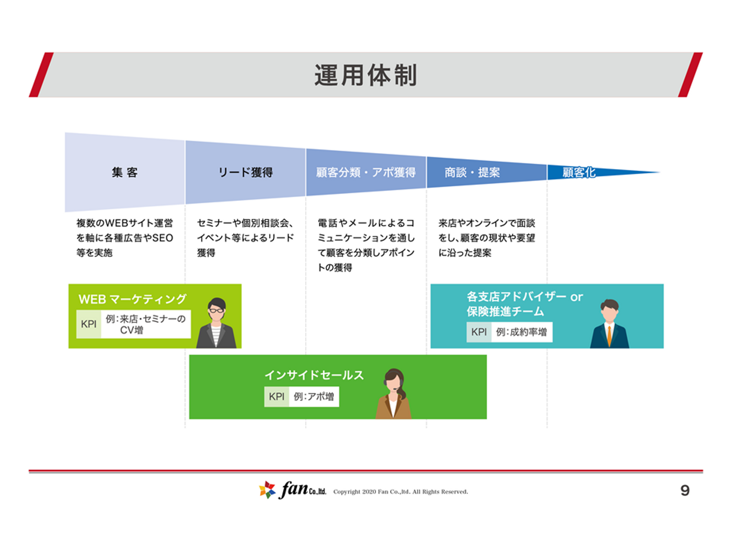 先日のIFAフォーラムの記事でもご紹介したとおり、Webマーケティング、インサイドセールス、IFAまでの導線を意識した運用体制を築いております。それぞれのポジションごとにKPIをつくることで、メンバー全員がお客様ファーストかつ顧客化までの意識を持って目の前の仕事に取り組めています。