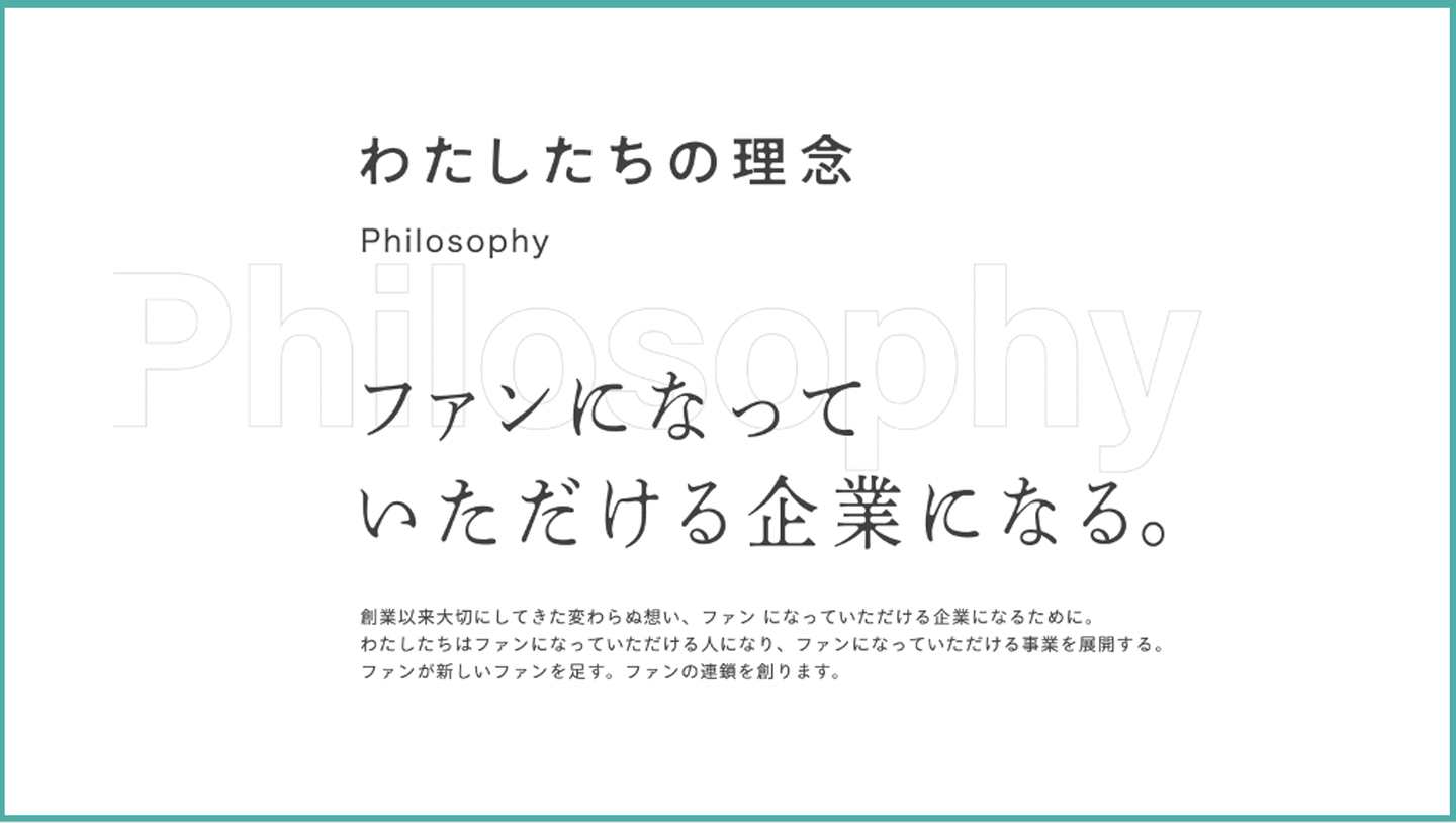 お客様からファンになってもらえるようなメンバーが増えていけば、事業がどんな展開を見せても、成長し続ける組織になると考え、「ファンになっていただける企業になる」という理念を定めました。